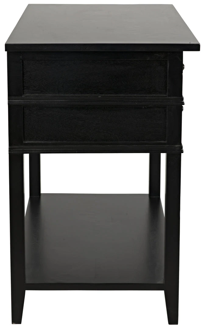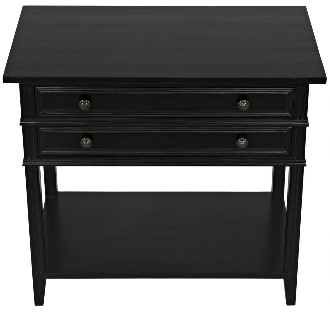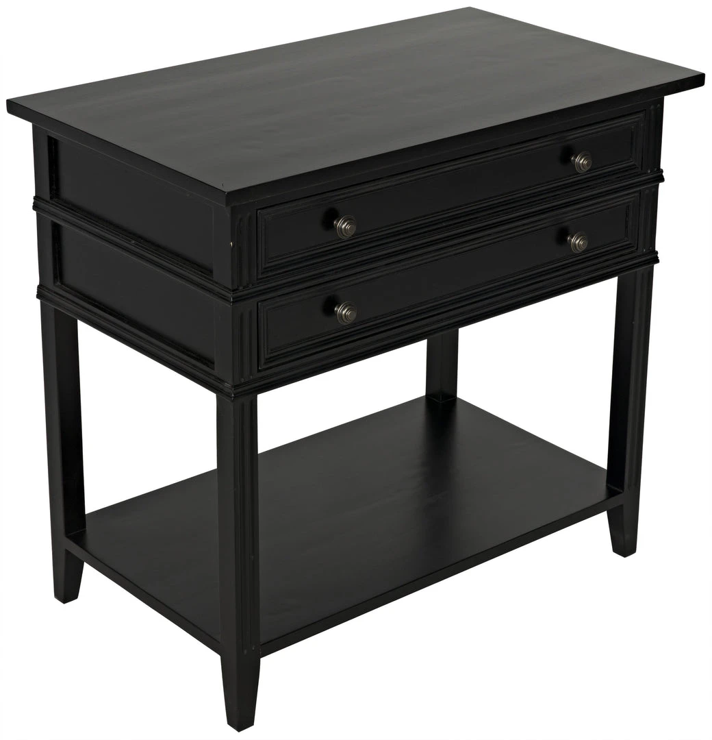 This lovely solid birch side table has not only been expertly distressed for the look of an heirloom piece, with its simple lines and masterful construction it is sure to become one” Two slim drawers with complementary hardware provide plentiful handy storage.