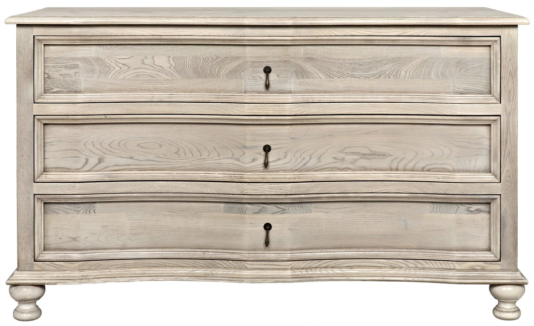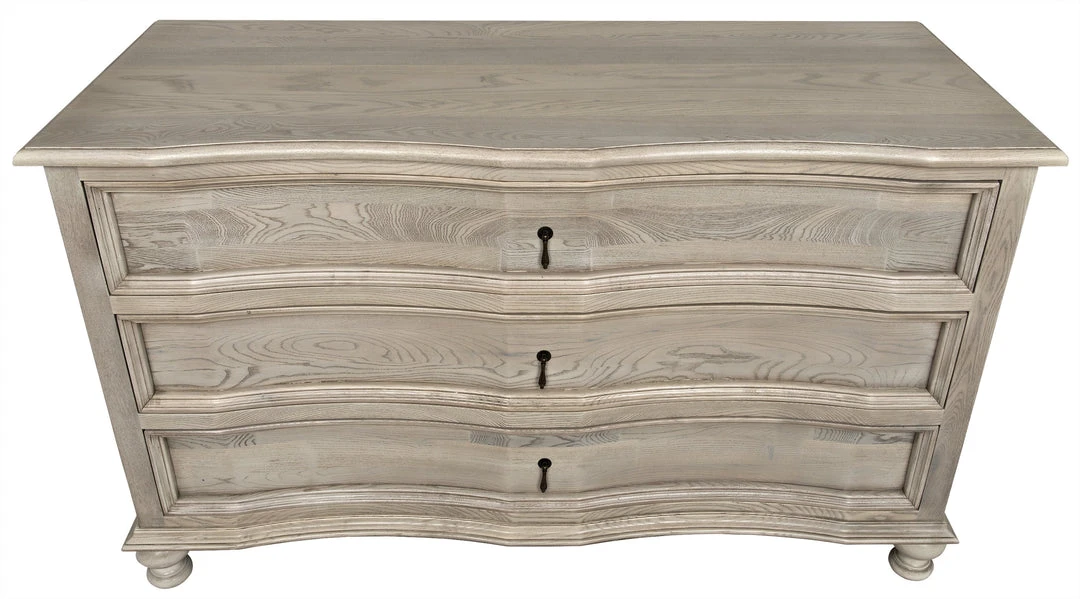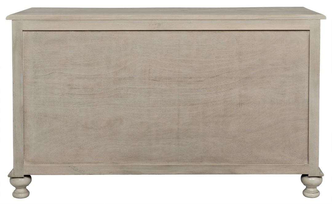 Expert hand-craftmanship elevates the traditional lines of this solid elm dresser. Finished in a vintage gray to enhance the elm’s natural grain, its features include metal runners that allow the drawers to open smoothly. Metal hardware and turned ball feet perfect the look.