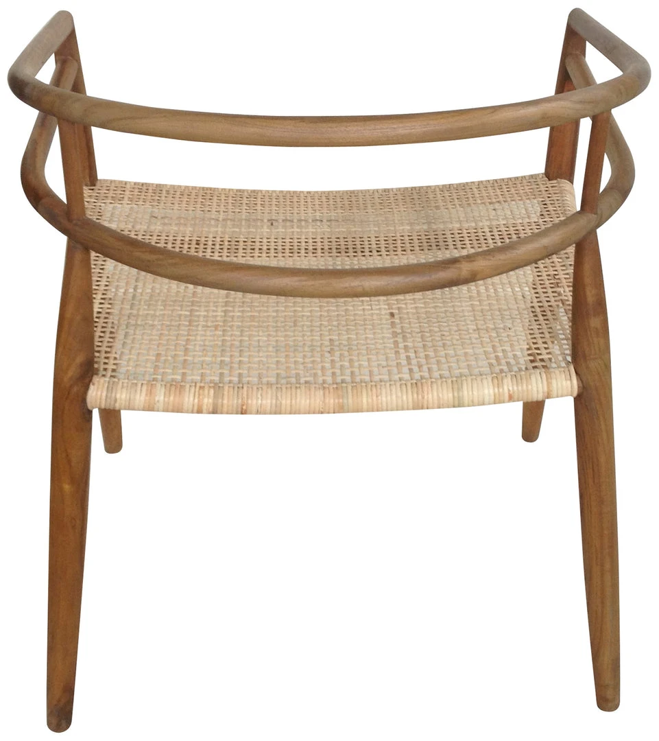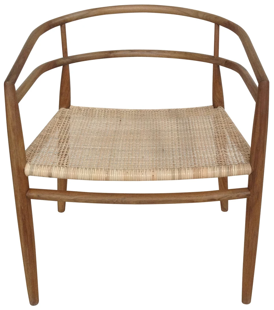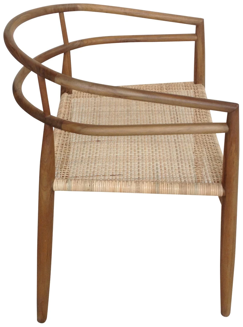 A softly curved teak chair accented with expertly hand-woven natural rattan, this classically elegant chair is minimally finished to celebrate the tone and luster of its materials. Comfortable and timeless, it effortlessly elevates any decor.