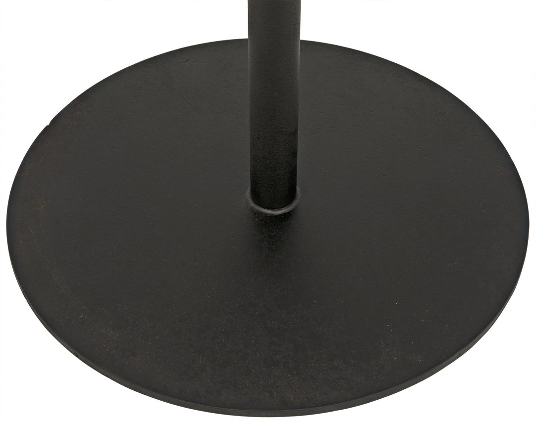 A simple round of expertly finished gold teak contrasts with, and perfectly complements, a round metal base in this simple, but masterfully realized design.