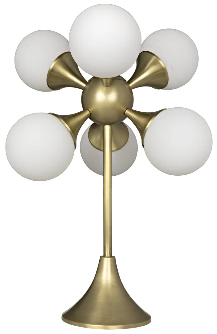 Warm, antique brass finished metal centers six white glass orbs in this decorative desk lamp. It is the perfect piece to set off your mid-century modern decor”