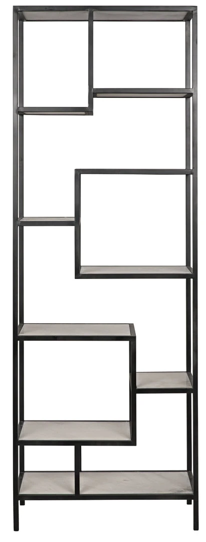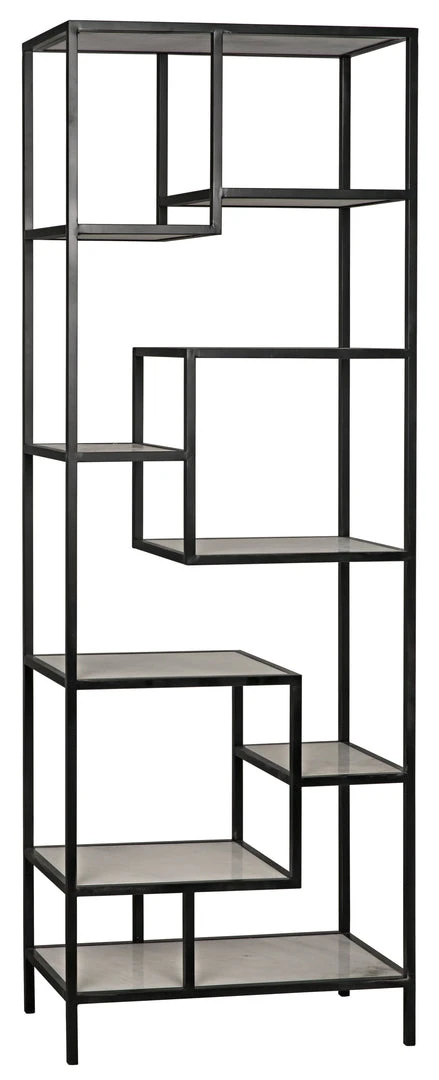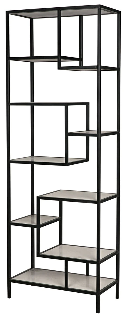 Energetic lines intersect geometrically to support nine varying sized shelves of genuine white quartz. With its strong lines and high/low combination of materials, no other ornamentation is required.