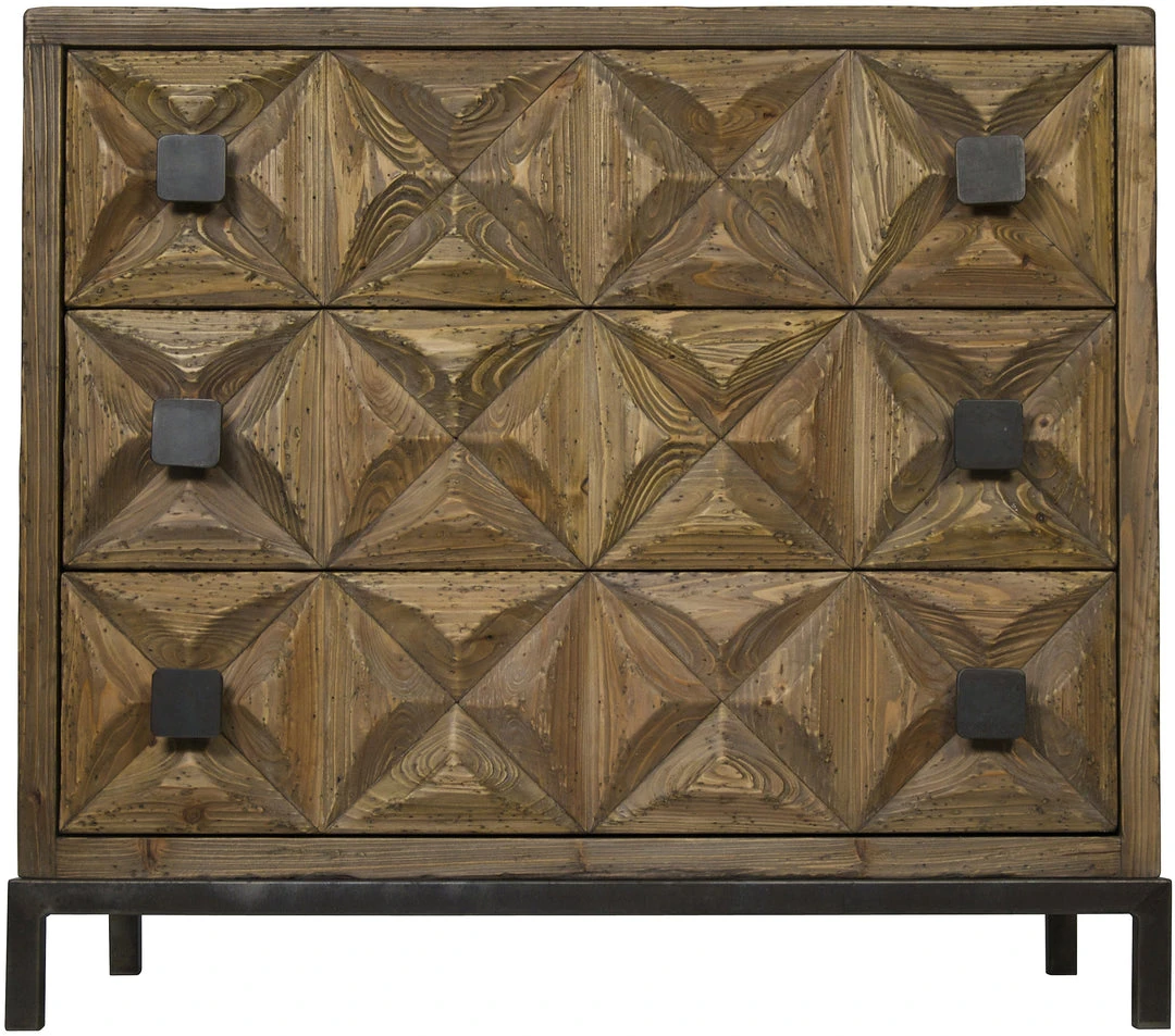This intricately hand-carved reclaimed fir and metal sideboard has three generous drawers for ample storage. To let the carvings shine, the rest of the design is kept simple, and the wood is finished minimally in a soft natural.: