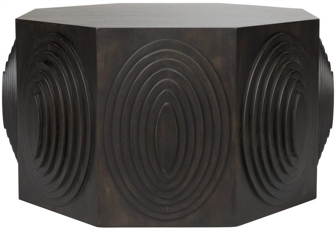 Expertly handcrafted of solid walnut and hand-carved and enhanced with intricate oval detailing on each of its eight sides, the pieces in the Jules collection are finished in ebony and can double as stools. A coffee and an accent table are available.