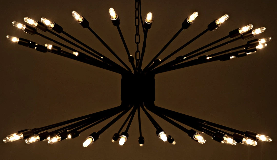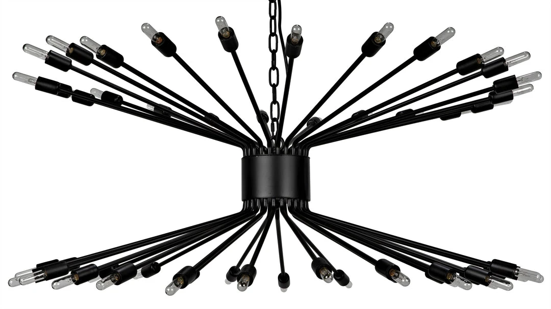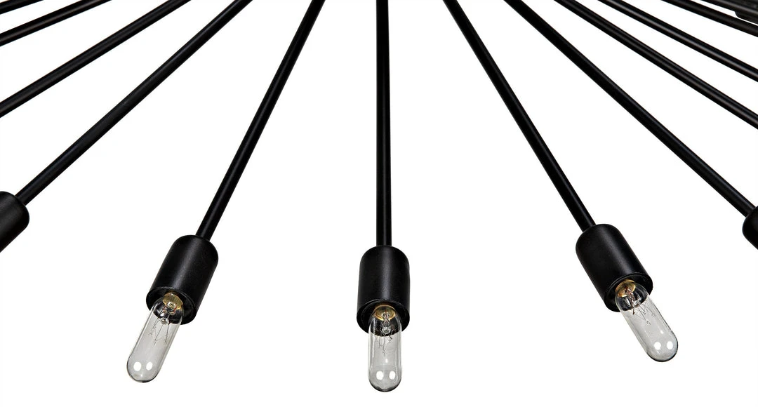 A dazzling display of design virtuosity, the artisan crafted Lampberto is an explosion of light. Two tiers, each with 24 spokes, radiate from the center. To keep the look clean and modern, the metal frame is hand finished in matte black.