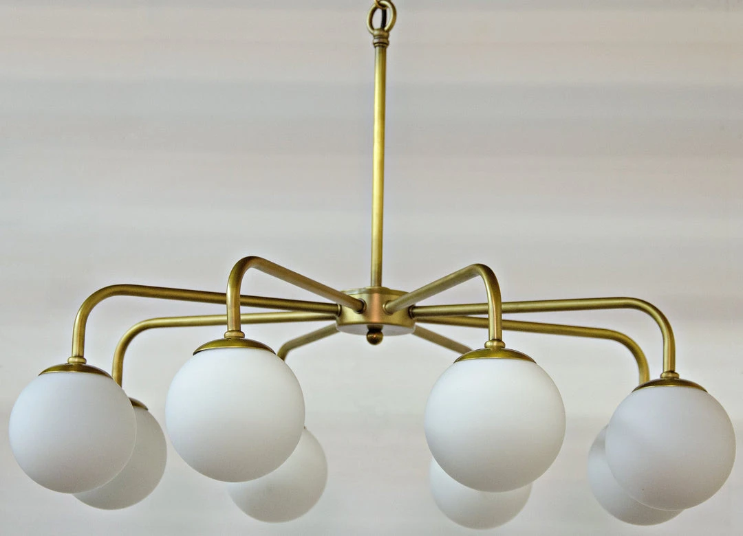 Mid-century modern lines in antique brass finished metal suspend eight glowing orbs in this retro-futurist take on a classic chandelier.