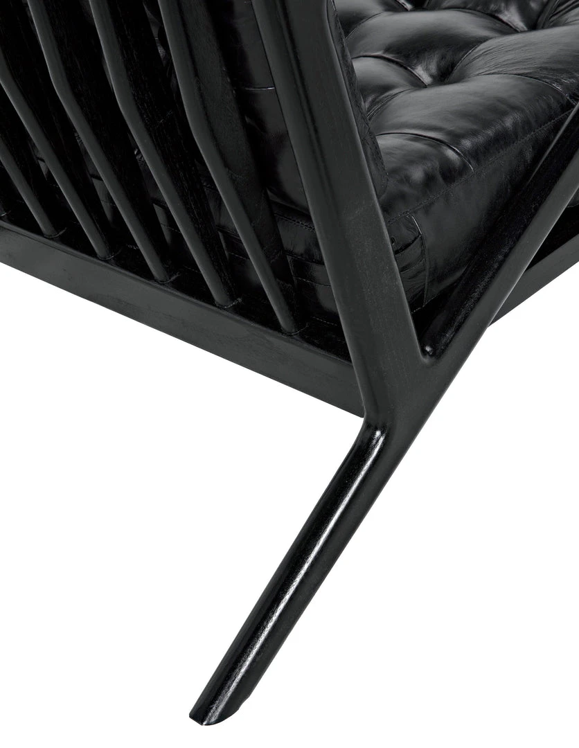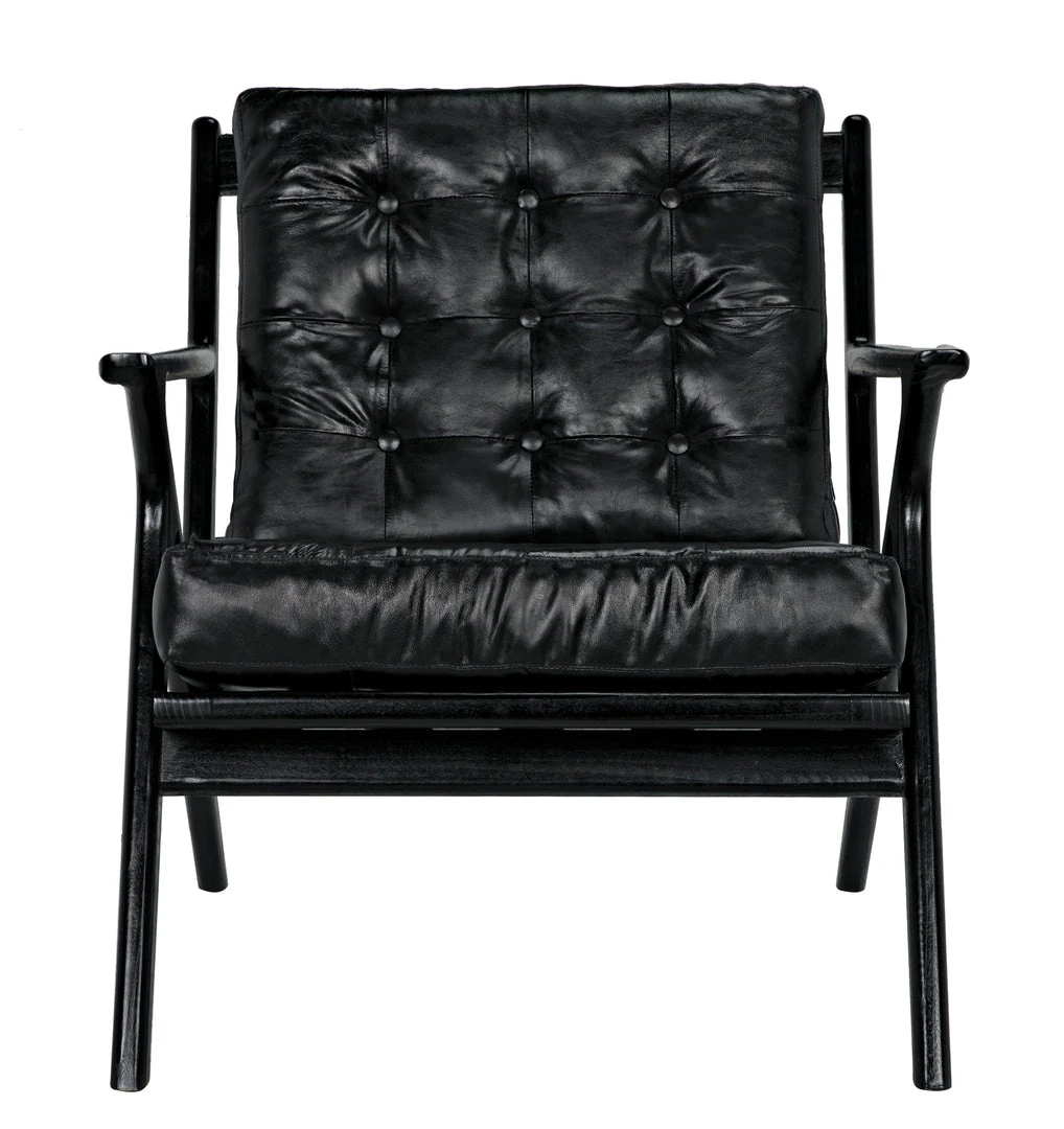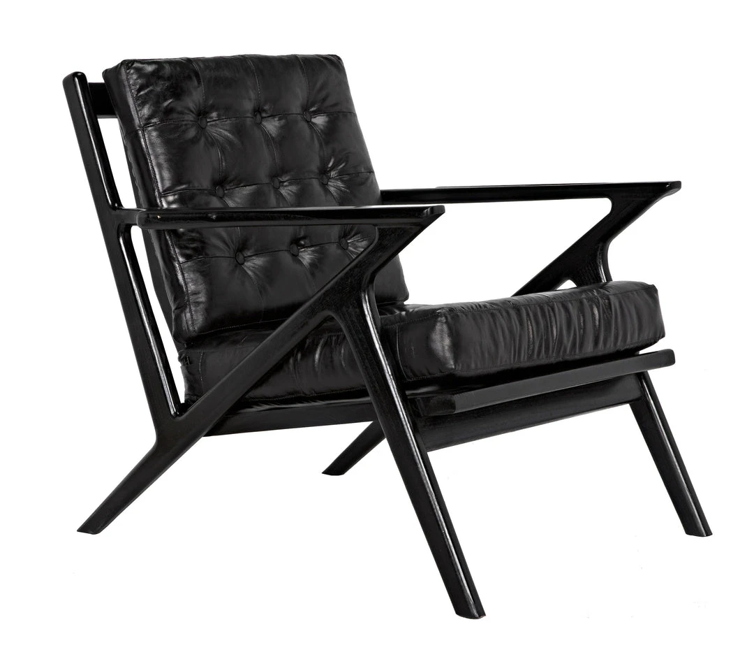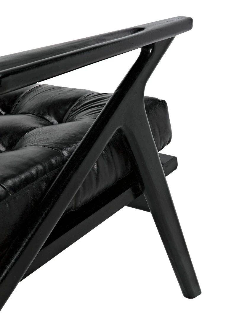 This uber chic upholstered club chair features include black leather cushioning for softness, and charcoal finished sungkai legs for an intriguing touch of edge.
