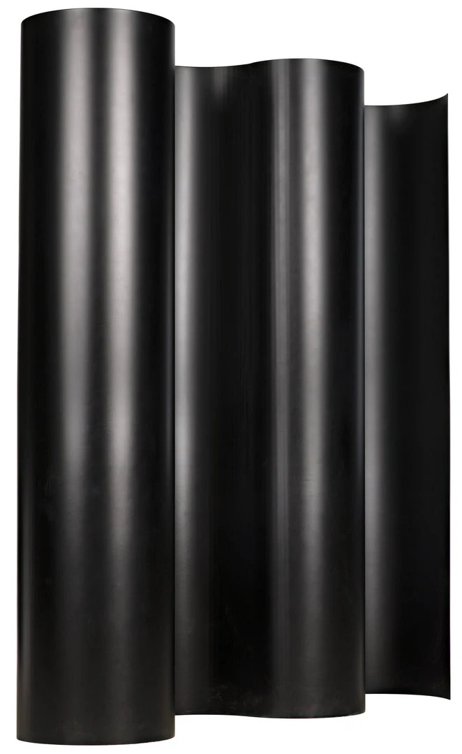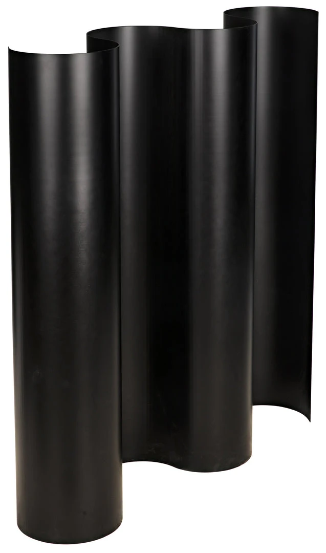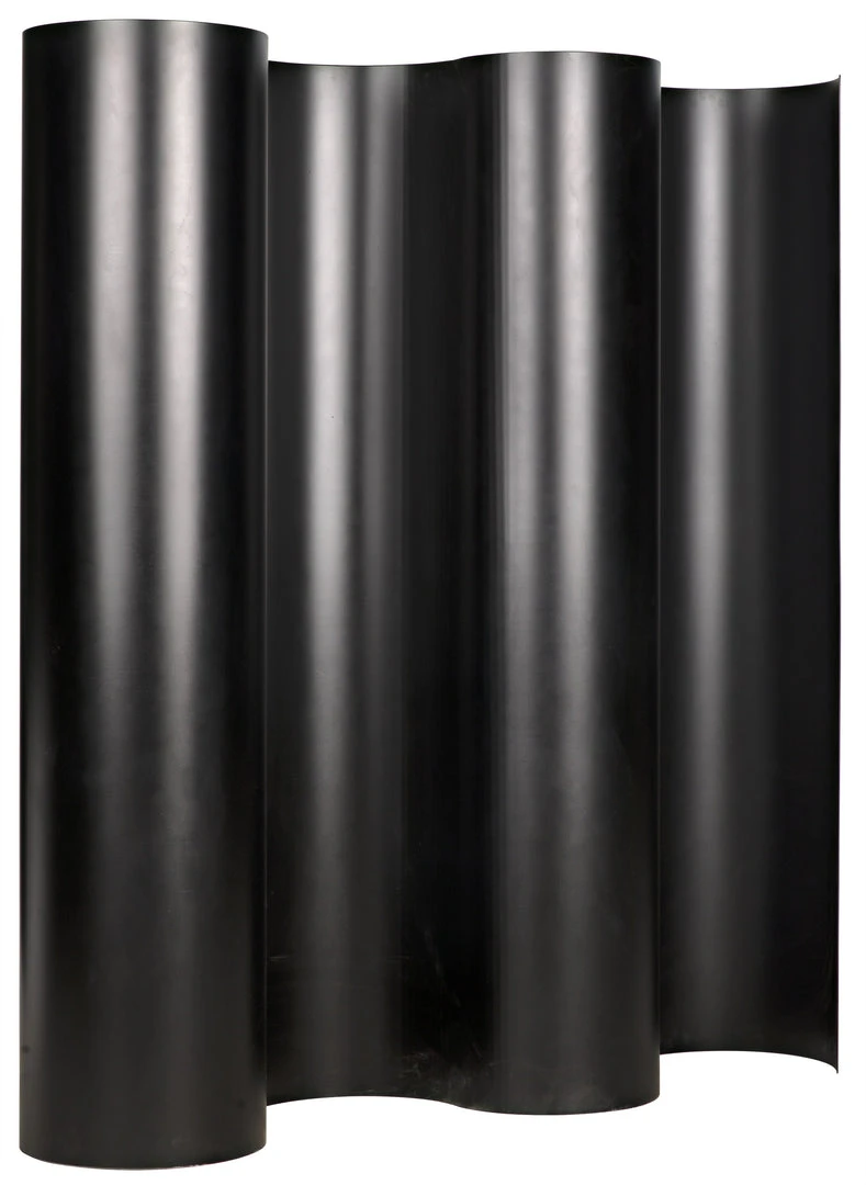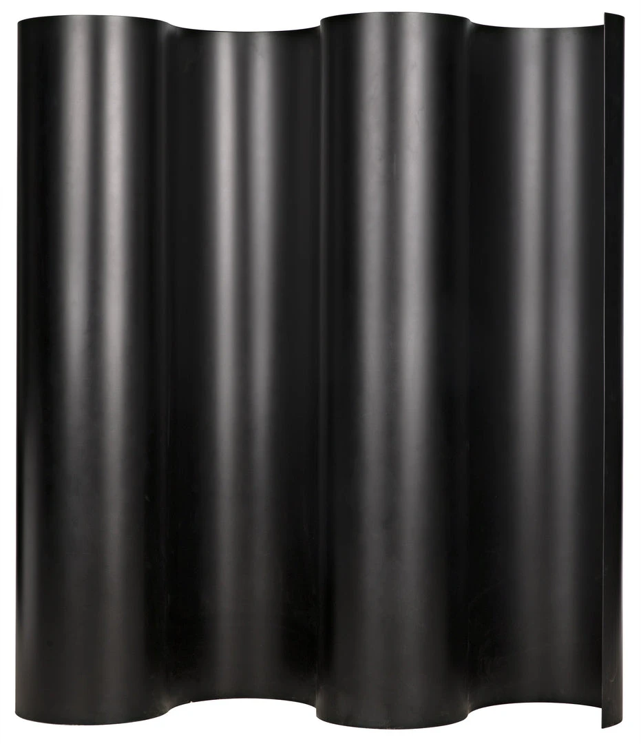 This impressive screen undulates across a room, its curves evoking dark mountain roads lit only by the moon. Handwrought of metal, its black finish has a softly burnished sheen. Whether used as a room divider, a privacy screen, or to make a powerful architectural statement.