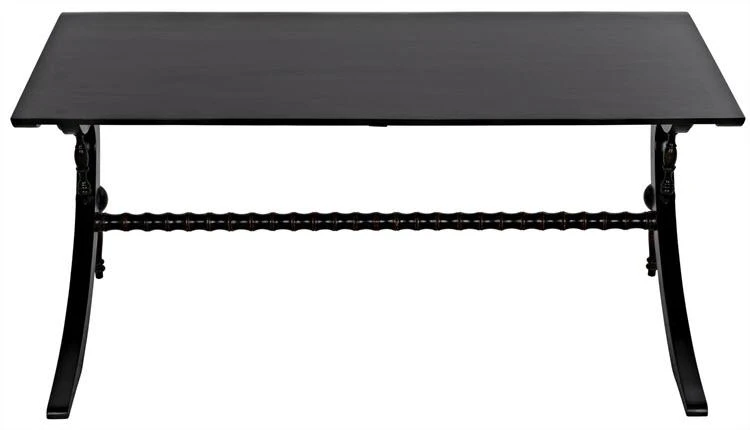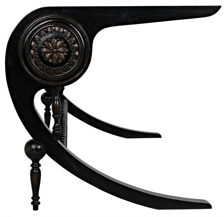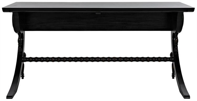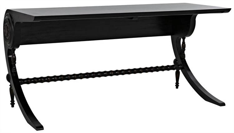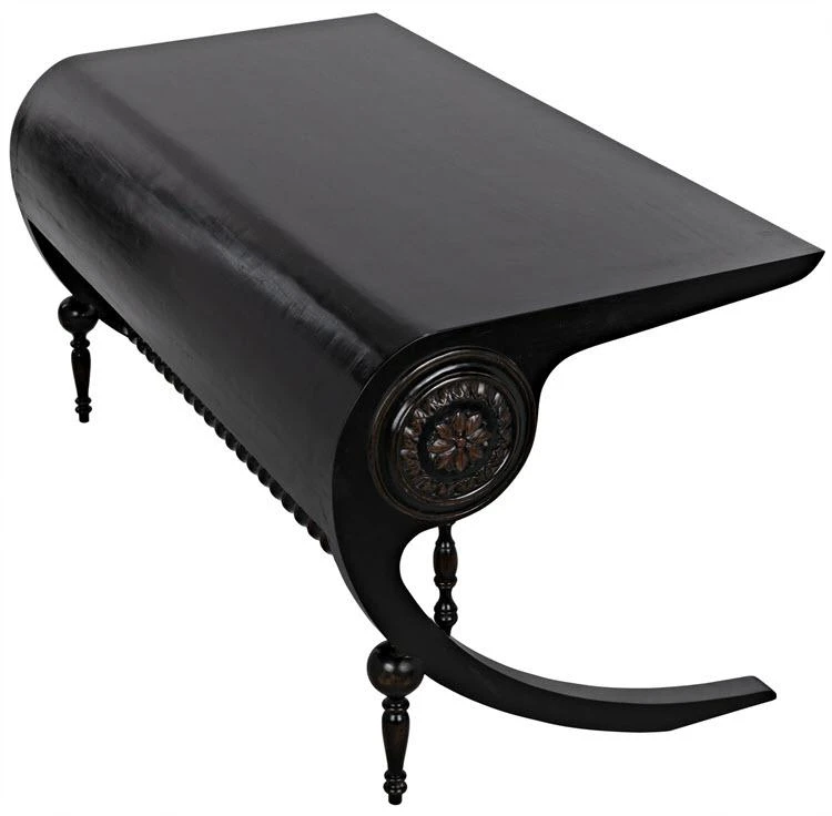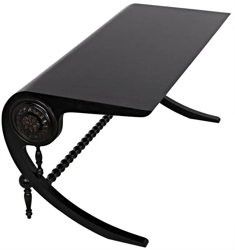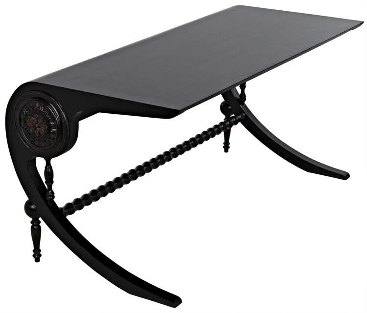 Unexpectedly elegant and decidedly decorative, the Mephistopheles desk has been artisan crafted of mahogany. Gorgeous carved details enhance the otherwise clean lines, and a curved base and turned accents provide additional ornamentation. Hand-rubbed black finish; brown trim.