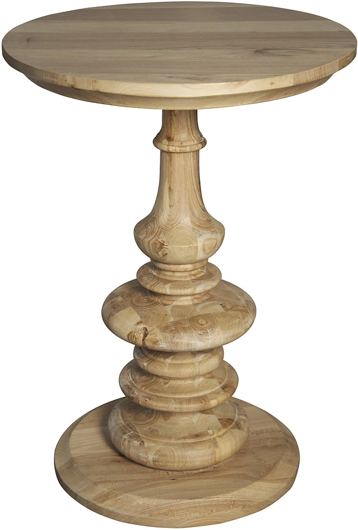 This beautifully turned recycled elm side table is minimally finished to honor the small flaws and decorative grain of the environmentally friendly material. Any knots, gouges, cracks and nail hole are a part of the allure of the piece, and why no two will be identical.