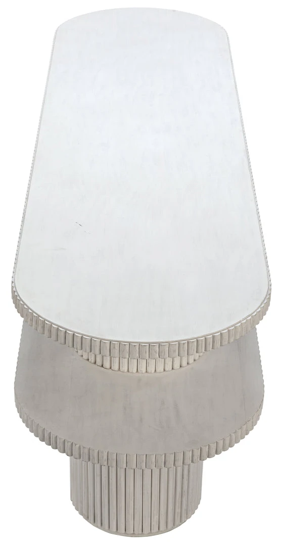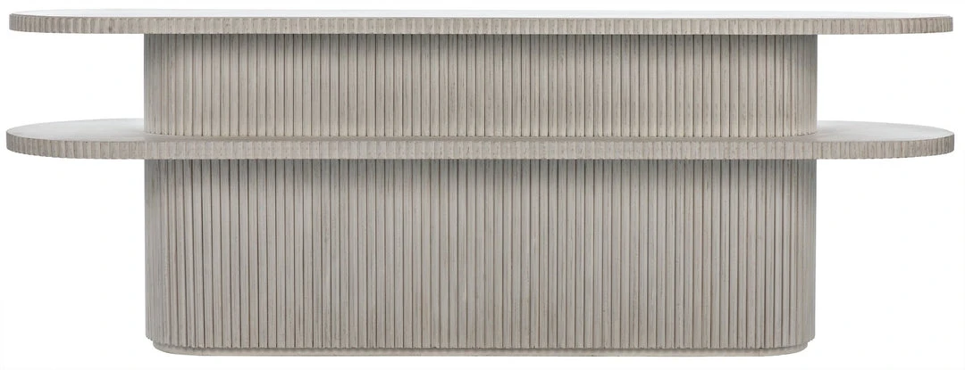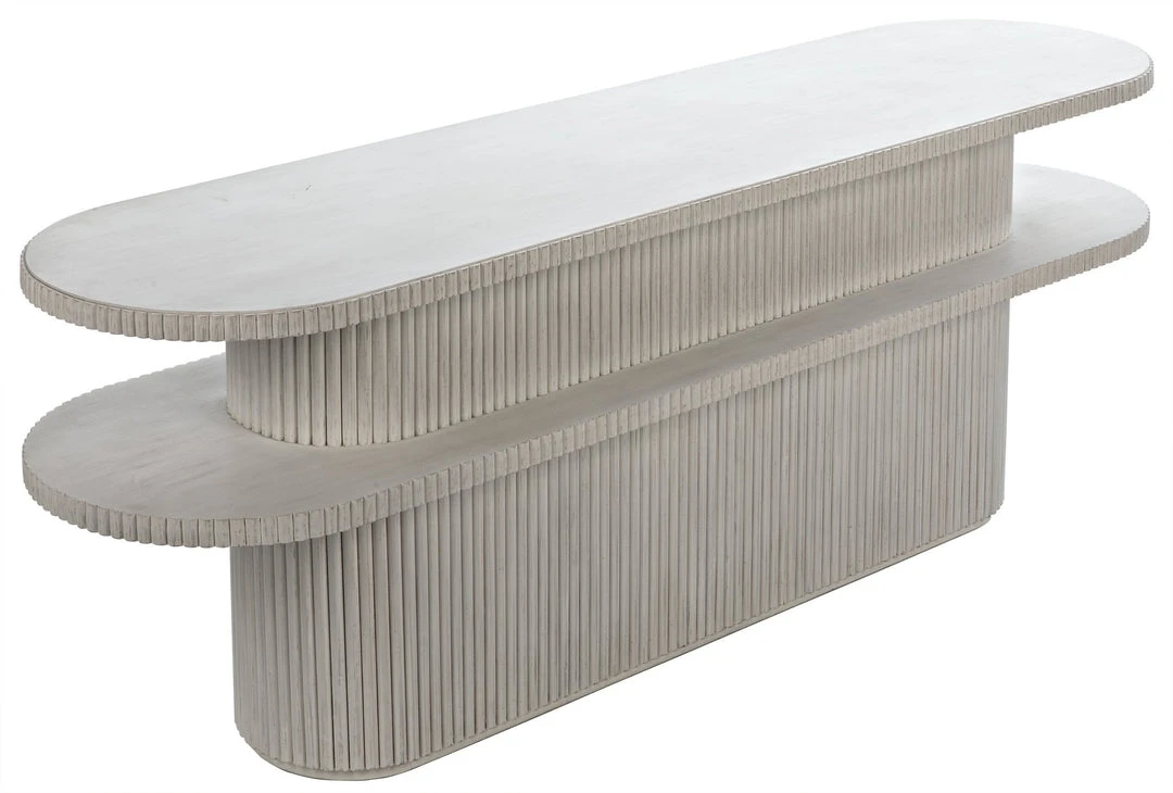 Whitewashed mahogany is manipulated masterfully here, in a curvy, contemporary console from Noir.