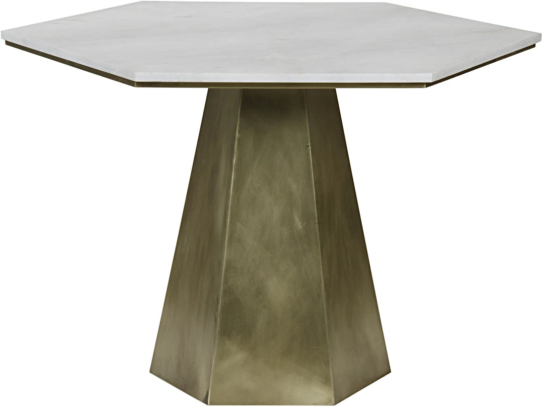 A pentagon pillar base with a burnished antiqued brass finish supports a hexagonal slab of natural quartz in this futuristic side table. Both materials are minimally finished; embracing, not erasing, their natural beauty.