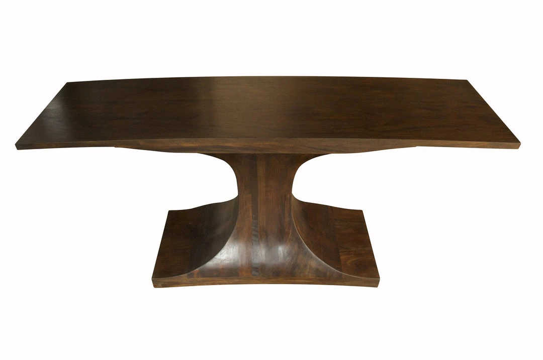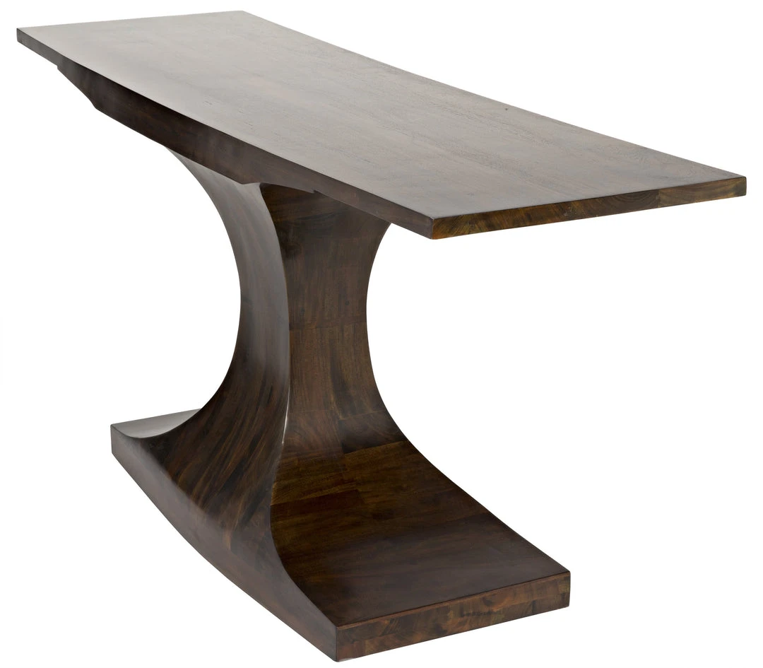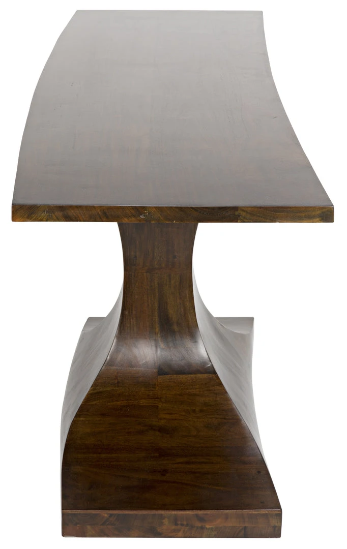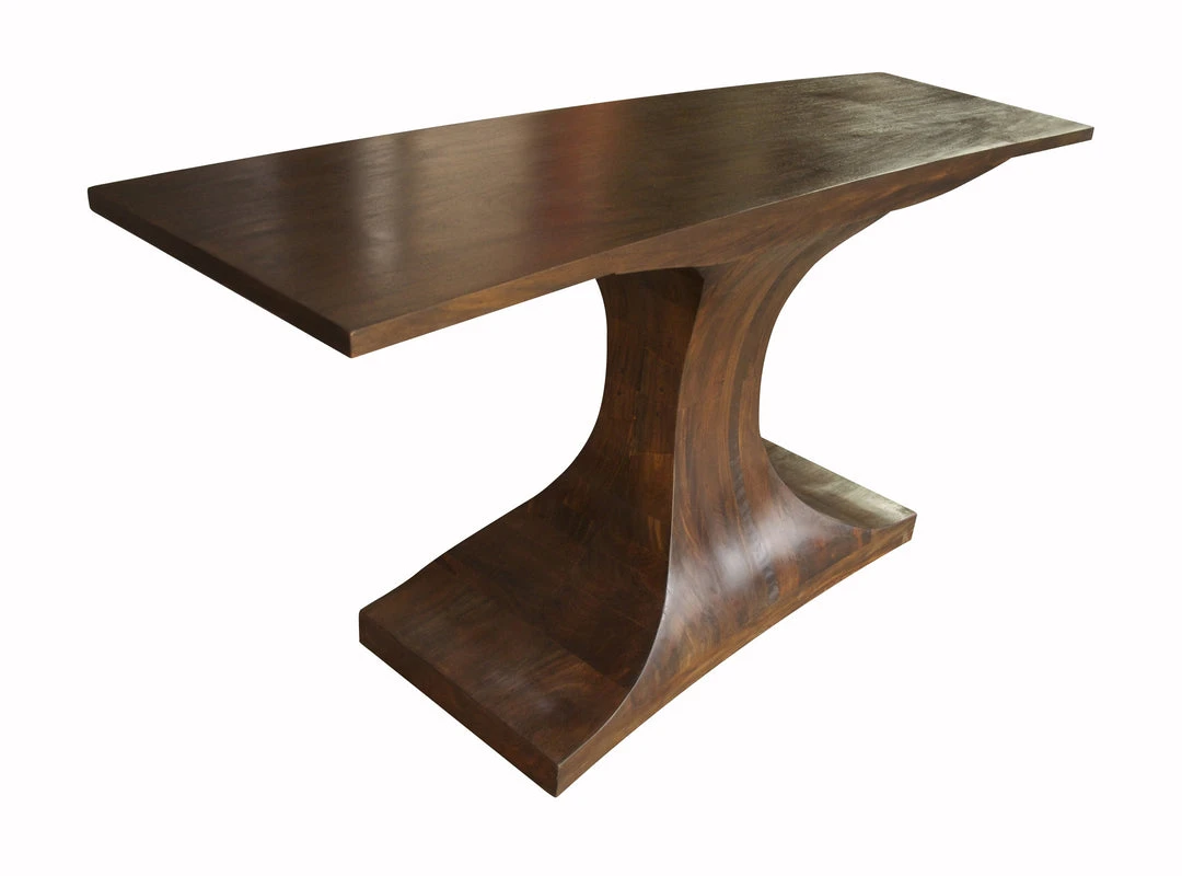 This mahogany console features minimalist, mid-century modern inspired lines and a dramatic pedestal base. The highly polished teak oil finish highlights the natural beauty of the wood and its grain.