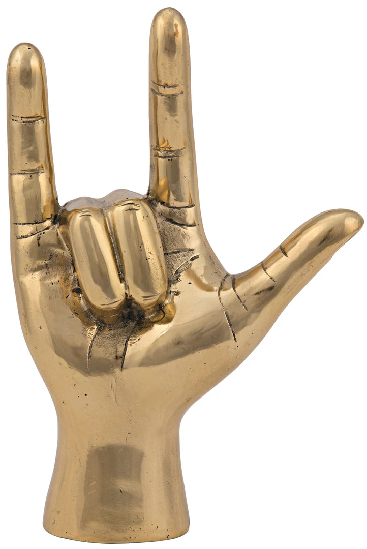 “This striking brass sculpture casually declares “I love you” in an unexpectedly chic way, adding pop to any decor. Handcrafted with a textural antiqued brass finish, the look is fresh, young & now” Available in six expressions and two modern metallics.