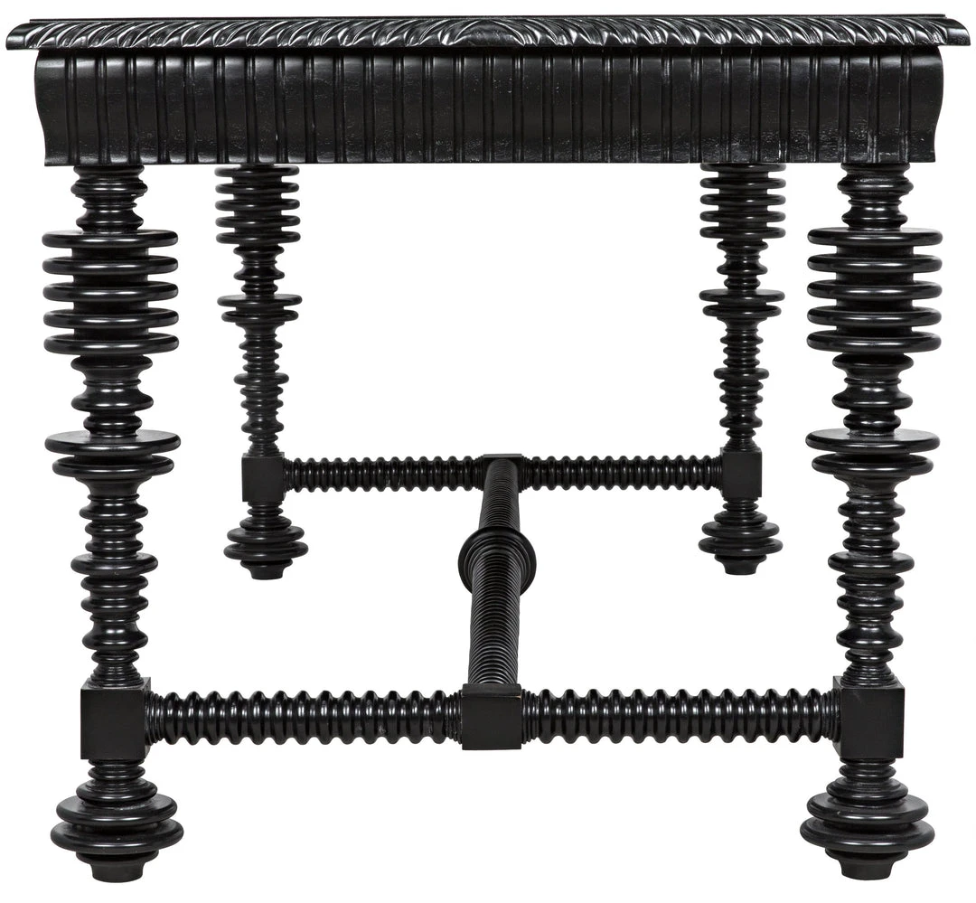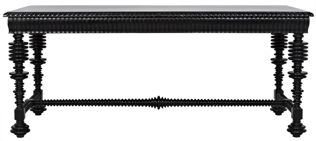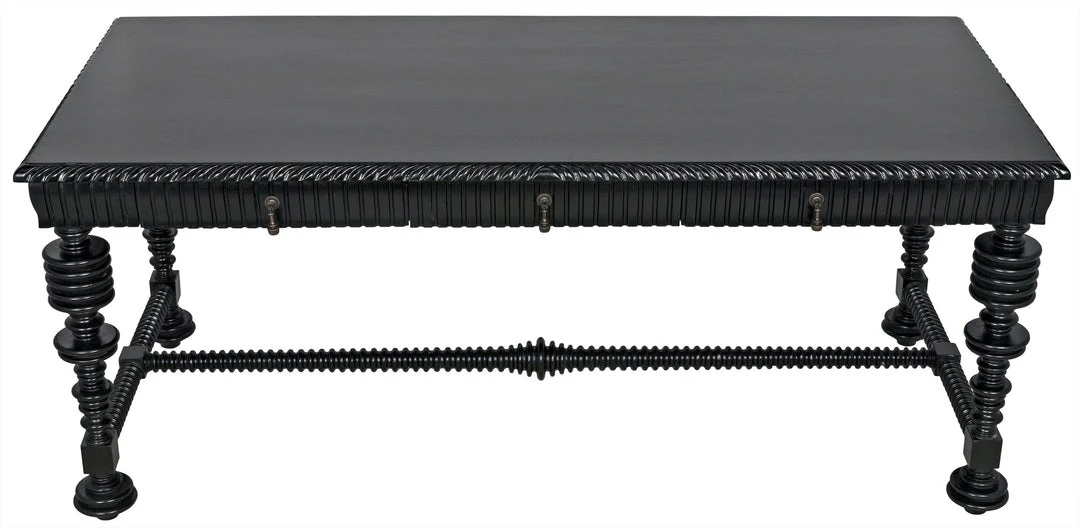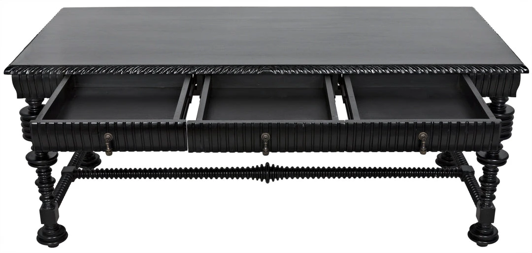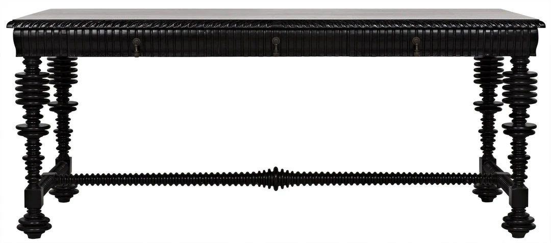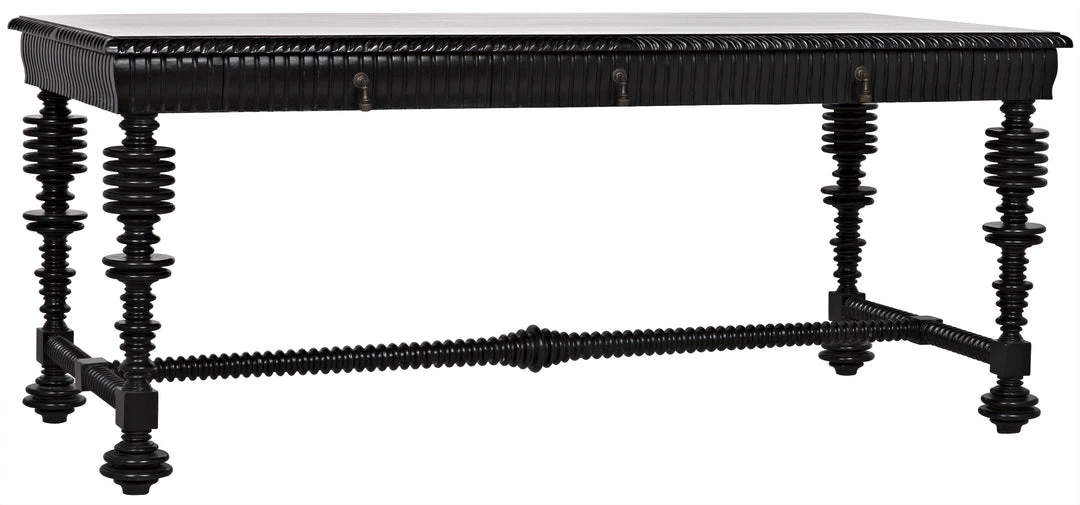 This striking desk is a sublime example of spool turning. Its magnificent legs and stretcher, ornately carved apron, and mahogany construction elevate an otherwise simple design. A rich-hand rubbed finish and brass pulls complete the look, and three drawers keep you organized”