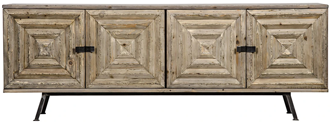 A rustic sensibility is paired with intriguing, hand-carved embellishments in this striking sideboard. Each is solid fir with a softly distressed natural finish, and features metal legs and hardware. Two large cupboards, each with one adjustable shelf, provide ample storage.:
