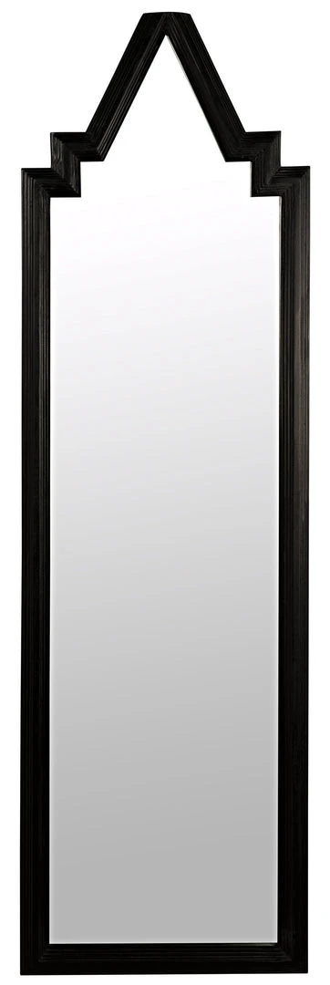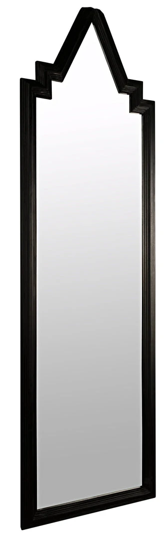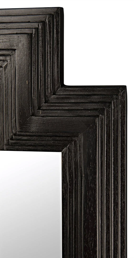 A rectangular wall mirror topped with a little hand-carved excitement, the Rey mirror has been handcrafted of glass and sungkai wood with a rich charcoal black finish.