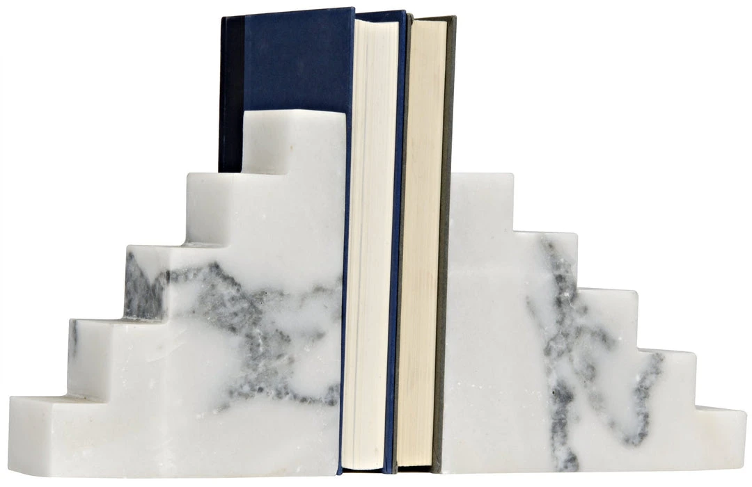 Hand-formed of white marble, these accent pieces were designed with simple lines to allow the natural material center stage. Each is unique; no two pieces of stone are identical. The set includes two bookends, the collection includes candle accessories, bowls, urns, & more.