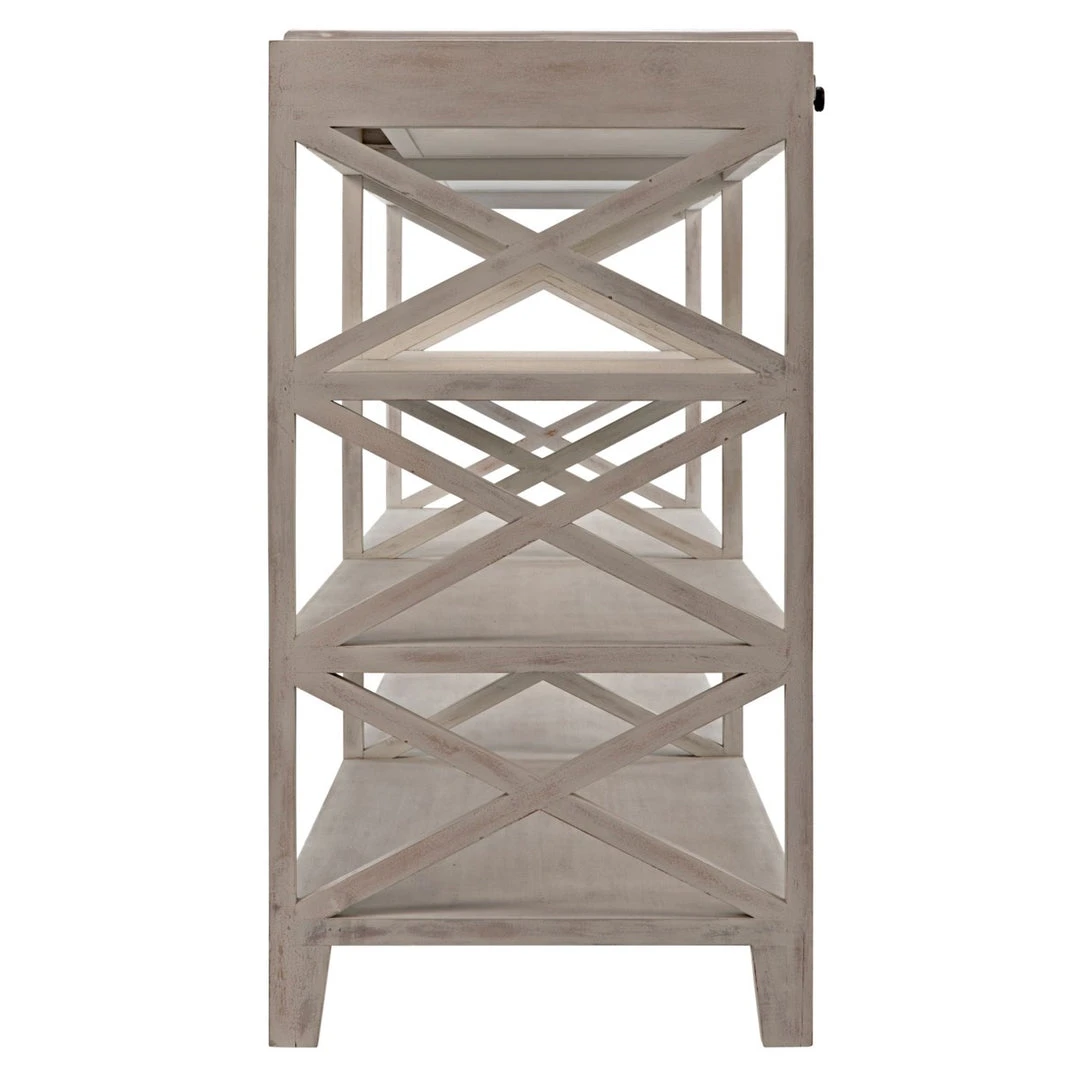 This sophisticated yet simple console has been hand-carved of solid mahogany, with a white wash finish. Its many features include three generously sized shelves and striking carved repeating X” embellishments.