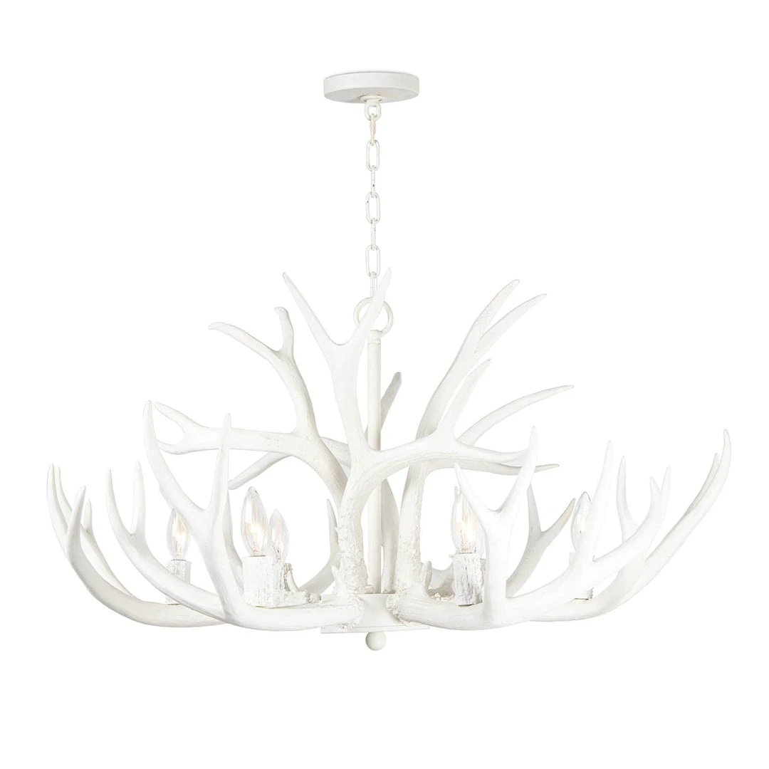 The resin Antler Chandelier wears a modern, matte white finish. Hang in a living room, kitchen, dining area or office to create a modern-lodge feel. A sculptural masterpiece by day, yet especially enchanting in the evenings when lit — the warm glow of the light from this unique piece cascades over the white-washed antler shapes in a way that truly makes you feel “at home”.