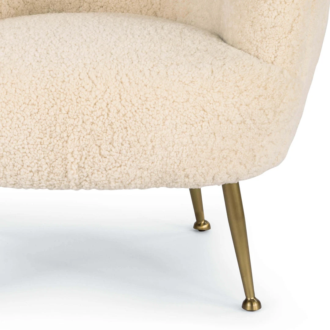 The modern simplicity of 1940’s Scandinavian design gets infused with 1960’s Hollywood dinner party glam for this sensibly stylish club chair. Its enduring silhouette, soft sheepskin and natural brass legs will flatter any space. Often placed in pairs as side chairs or in fours as conversational-seating.