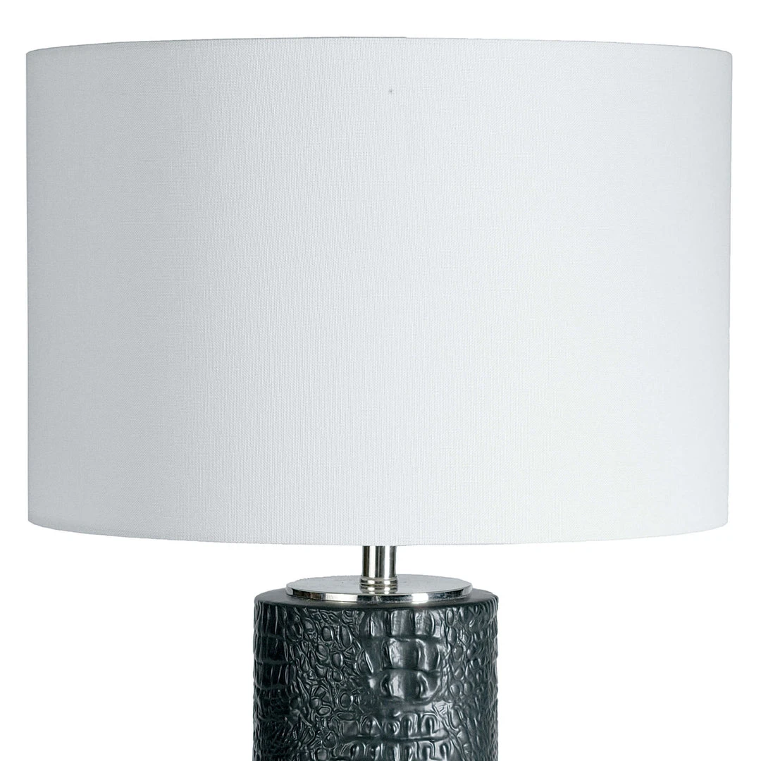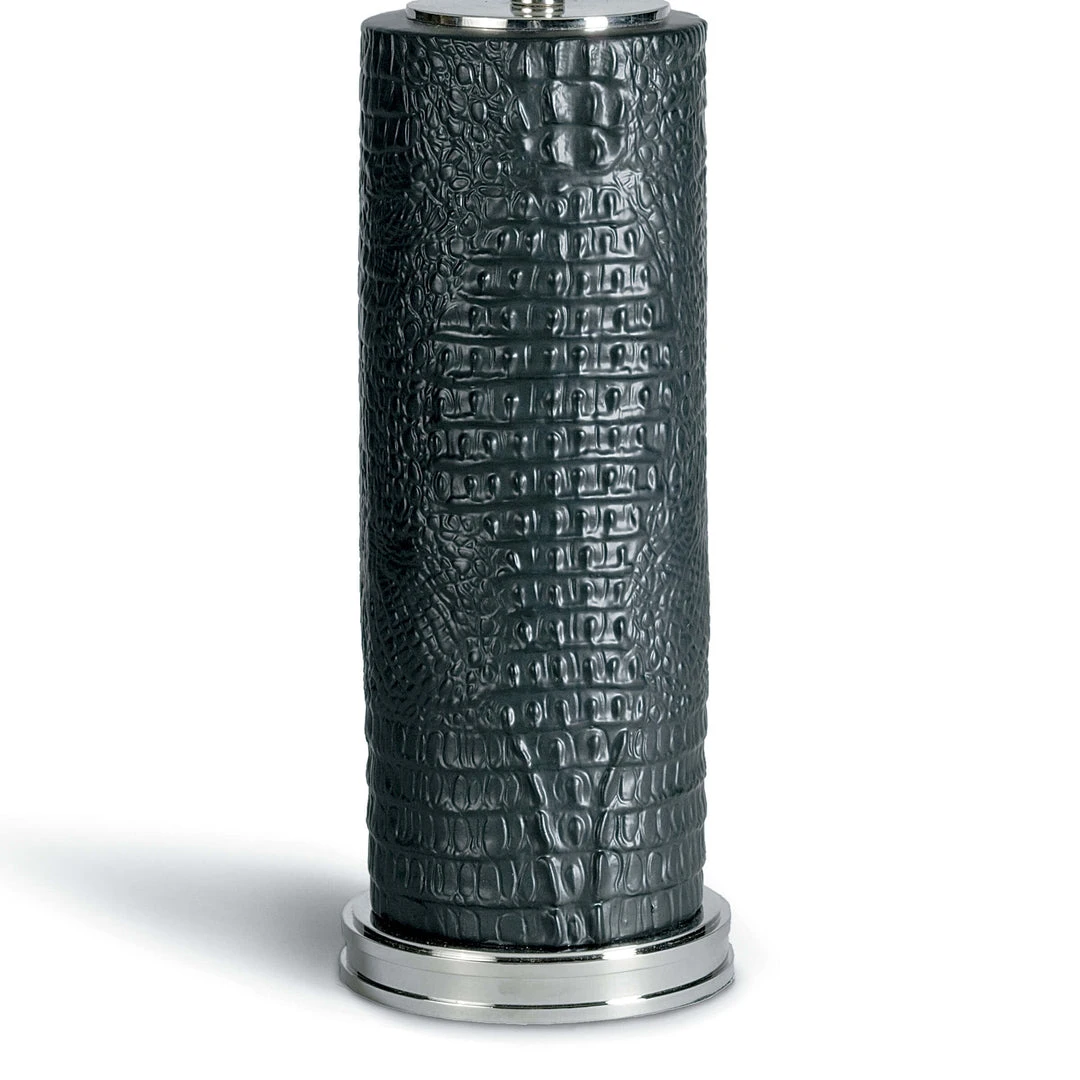 Crafted of ceramic and displayed on a polished nickel base, the Blake Ceramic Table Lamp looks stunning in any space. The lamp’s textured body was custom-made by co-founder, James Andrew, molded from a real crocodile hide and meticulously detailed by hand. James created a pattern that wraps around the cylindrical body of the ceramic base. This proprietary pattern is an example of Regina Andrew’s commitment to creativity and craftsmanship.