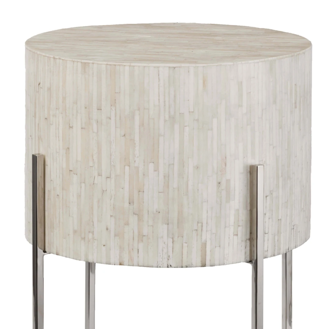 All the elements of this unique table come together perfectly: the intricate inlaid bone, the soft shape, and nickel legs, blending old-world style with a modern, mixed material sensibility. Use it to round out a contemporary arrangement in sophisticated style or to accent a modern ensemble.