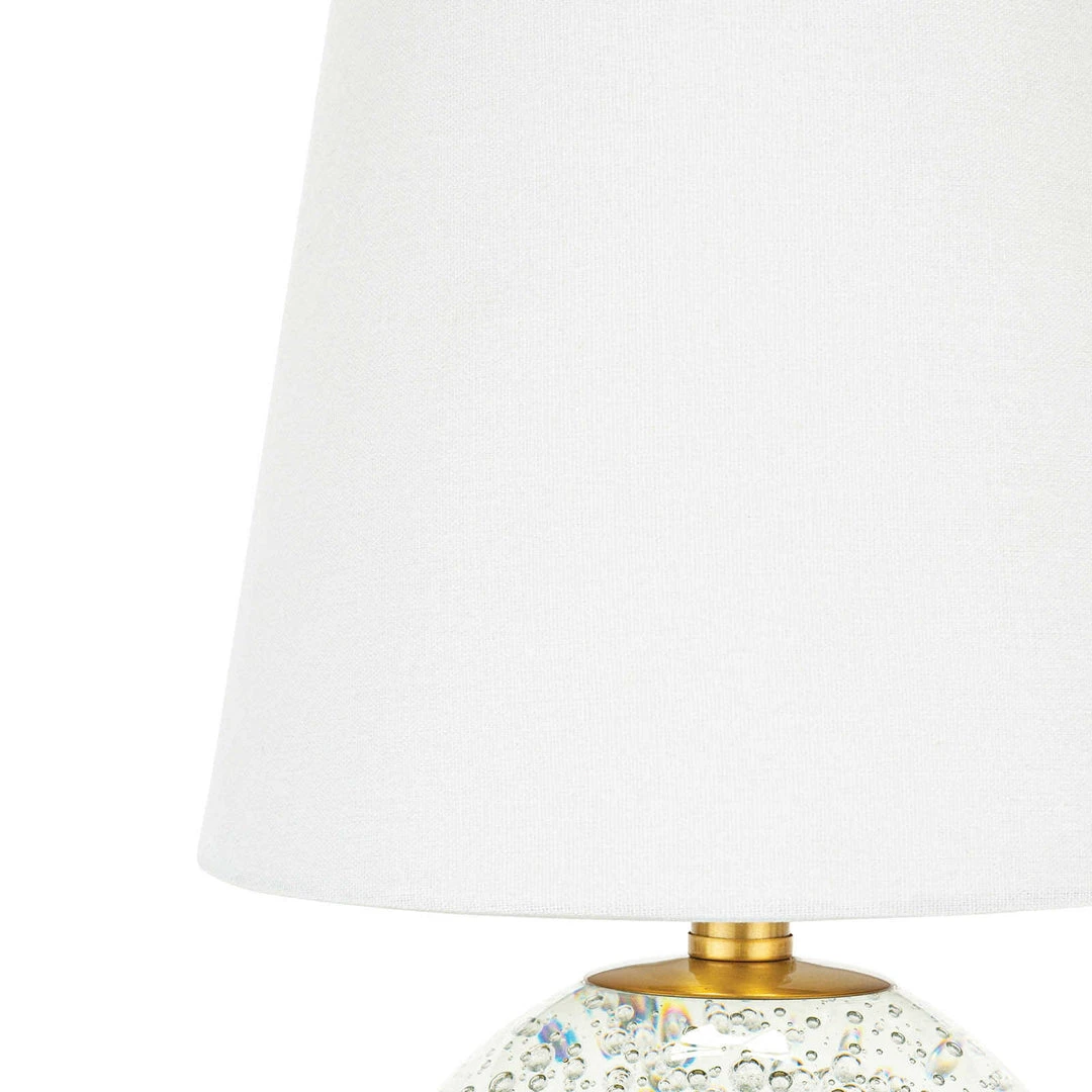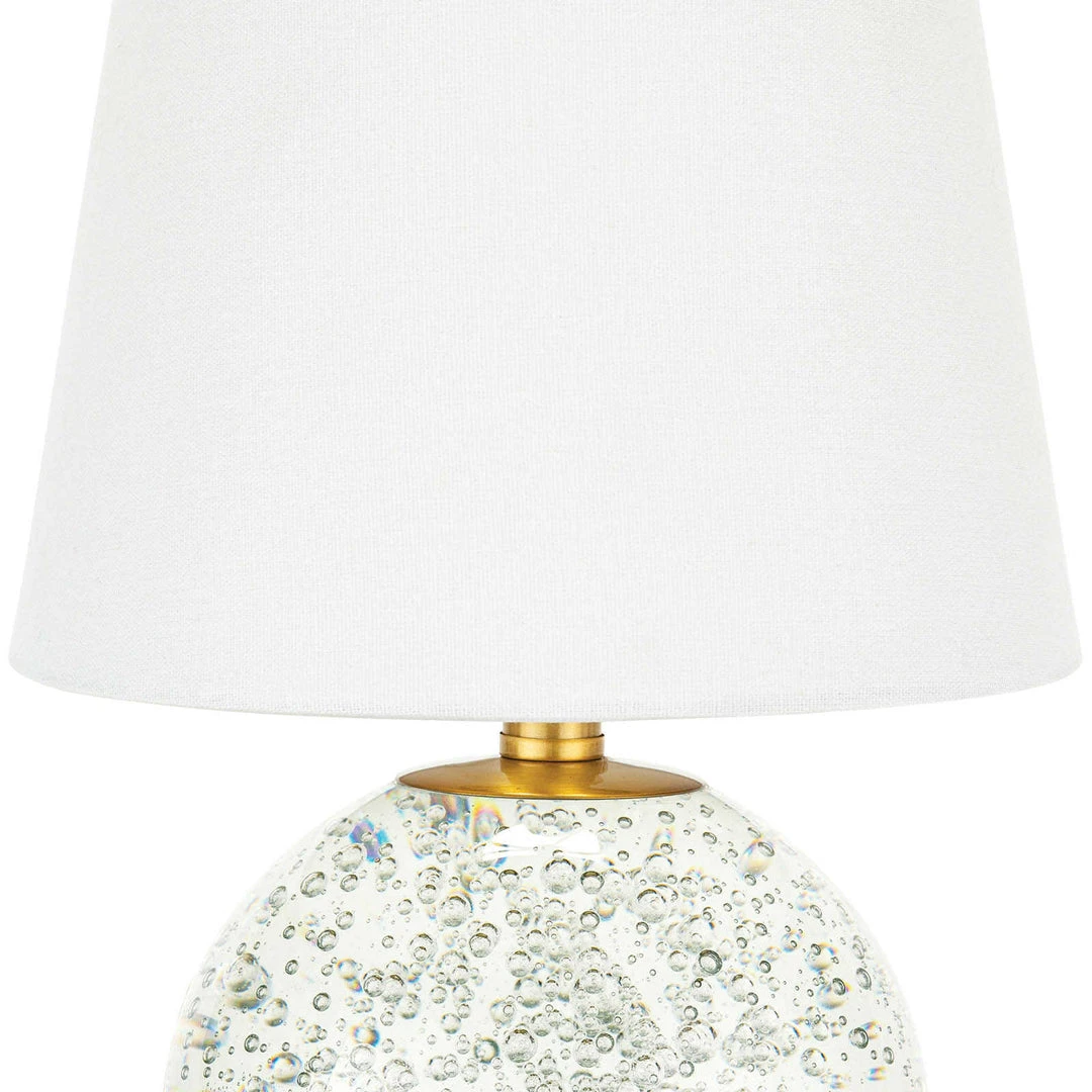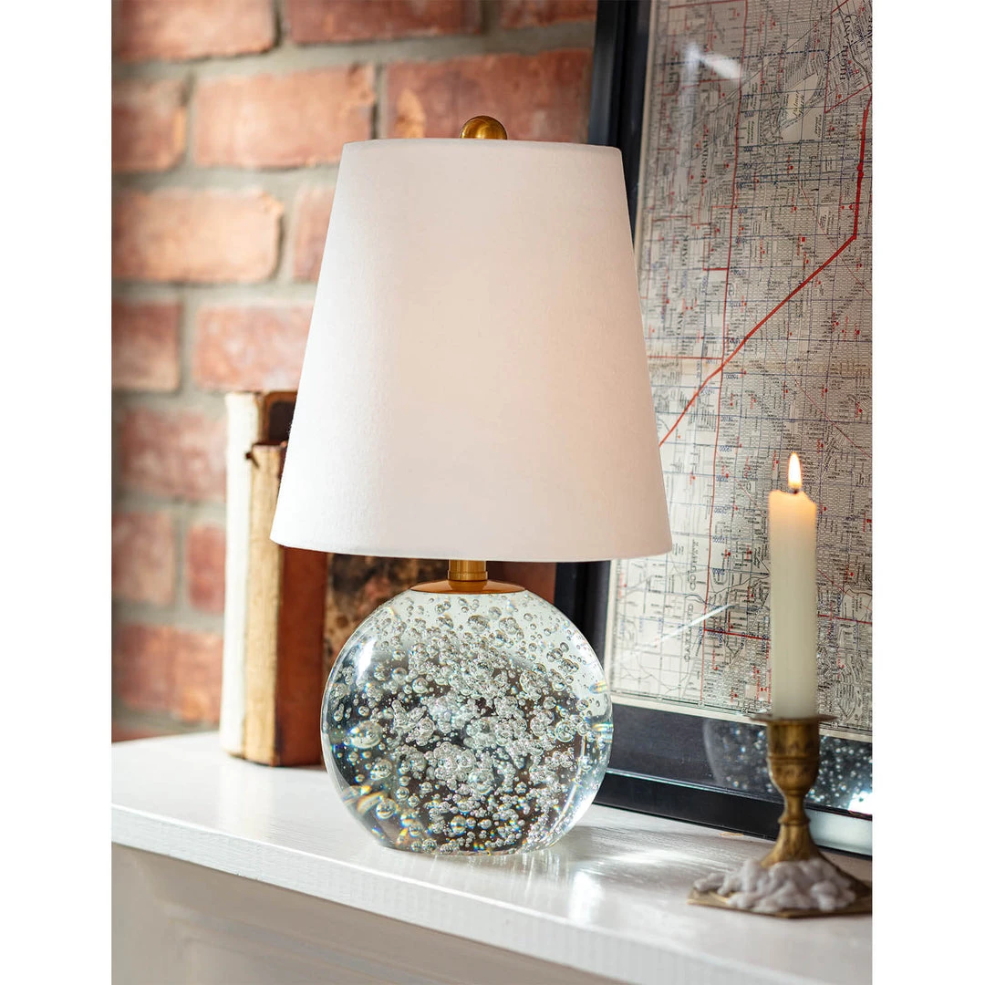 A classic spherical silhouette and crystal body has an alluring surprise element. Organic bubbles are suspended within the clear crystal body of the Bulle Mini Lamp. Simple, elegant detailing completes the piece in the form of a natural brass neck and ball finial that sits atop a crisp, tapered natural linen shade. The Bulle is the perfect lamp for a bedside table, small end table or to give illumination to a shelf or display.