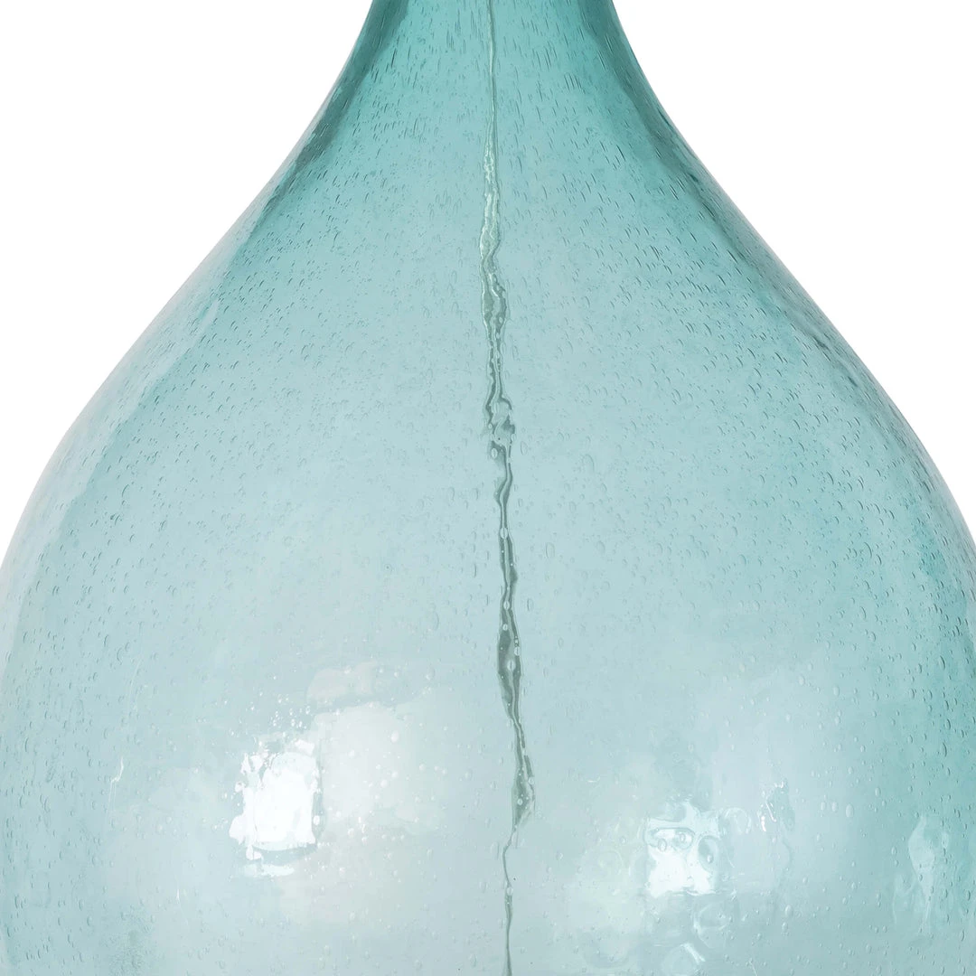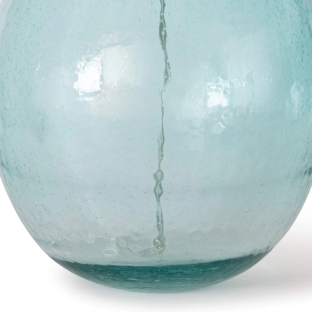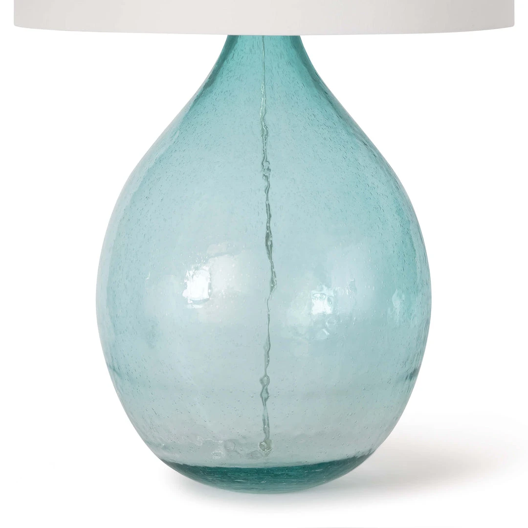 Translucent blue glass of the Catalina glass table lamp, evokes luminous and tranquility. Complimented with an natural linen drum shade and fitted polish nickel hardware to complete the coastal look.