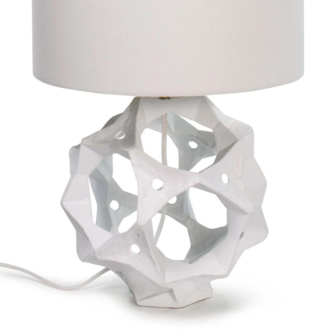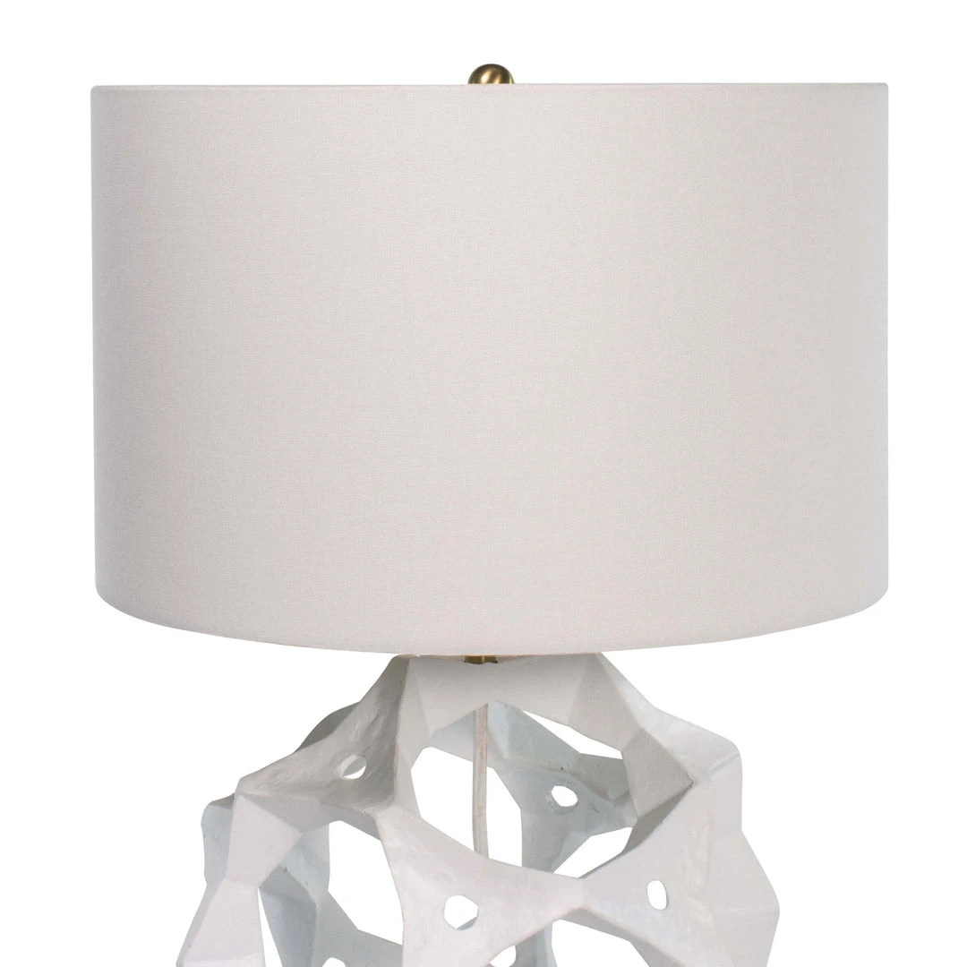The Celestial table lamp is a show piece. Its striking white carved base creates dimension, while the natural brass finial provides a modern contrasting accent. Place this in a living room for casually refined statement, perfect for coastal or modern decor styles.