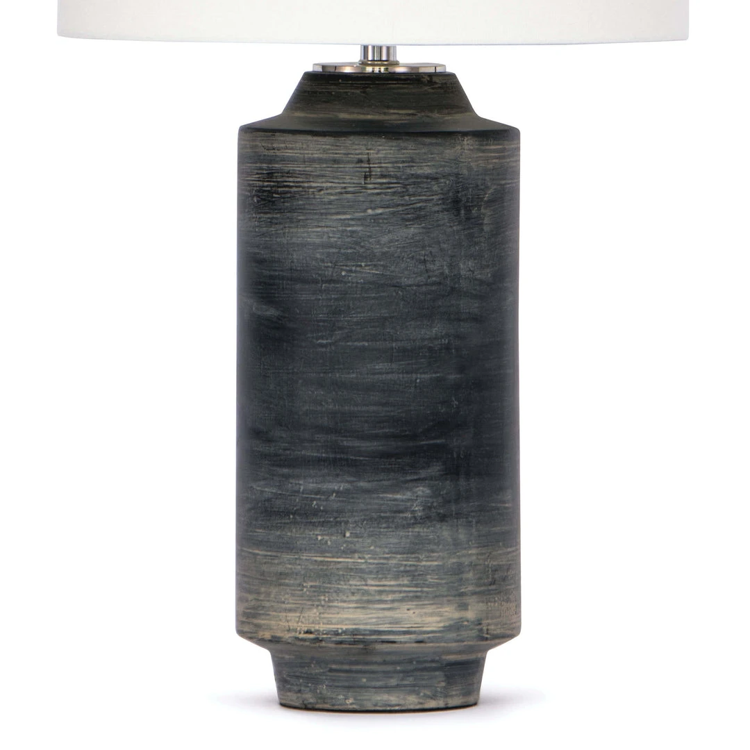 With a textural, timeworn finish, the Dayton ceramic table lamp has an earthly elegance that feels both industrial and refined. The simple cylinder silhouette is complimented by a natural linen drum shade and is topped with polished nickel finished finial.