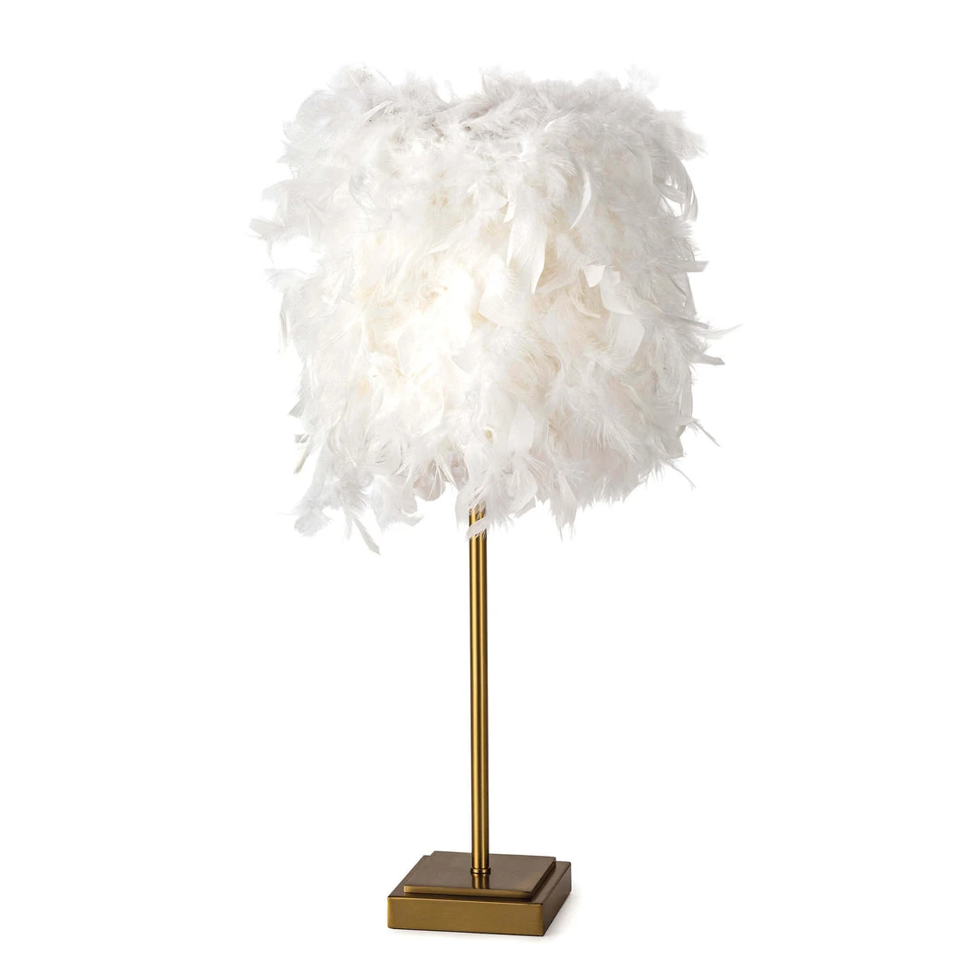 Go glam with Jasmine table lamp. Real duck feathers top a delicate, natural brass base to provide a look akin to a graceful bird. Place this statement piece in an office or bedroom for a modern, luxe touch.
