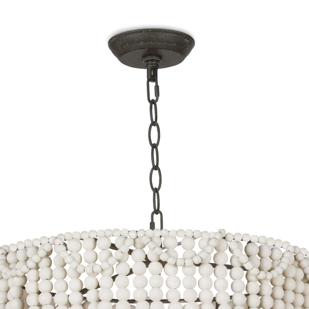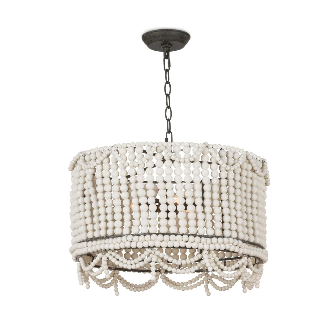 Classic style meets modern charm with this pendant. A bevy of draped wooden beads in weathered white, dresses up the steel structure, bringing out an earthy glamour to any space.