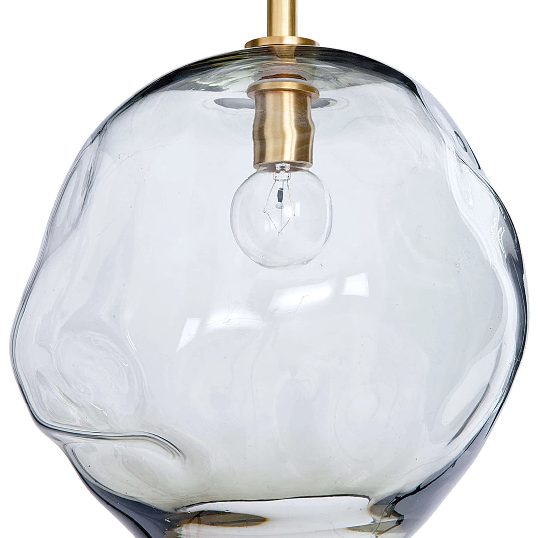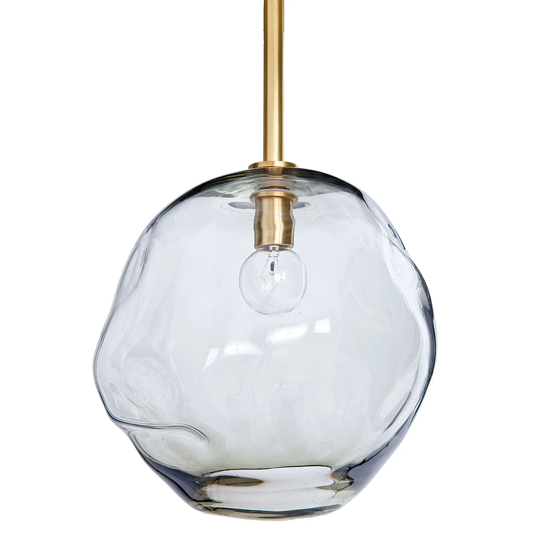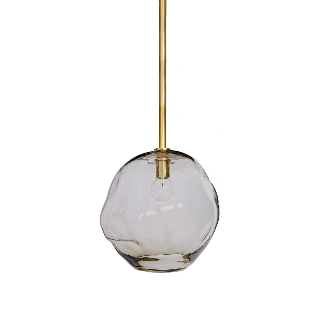 Smoke glass molten glass has an inherent beauty of variation in texture and size for a stunning modern appeal.. The eye catching organic form is suspended from a straight natural brass finished rod.