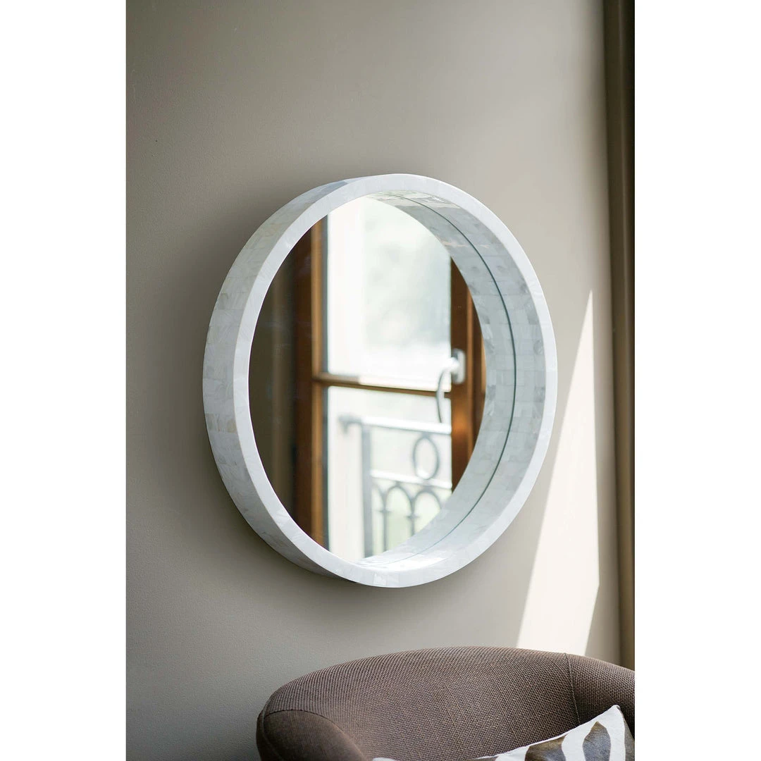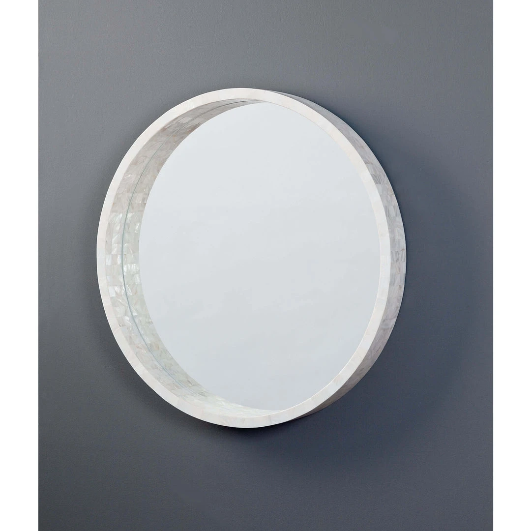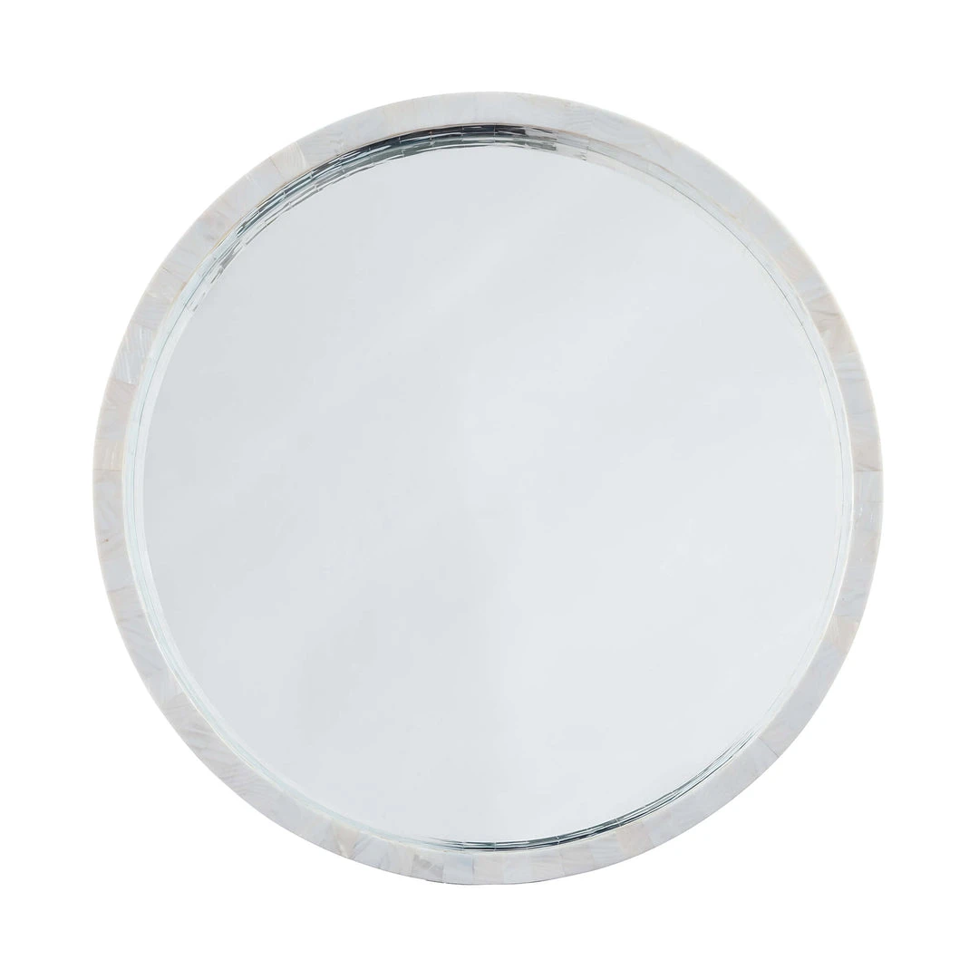 Ivory mother of pearl edges surround this modern mirror, lending a touch of subtle multi color and natural beauty. Versatile and timeless, this piece is perfect for brightening up your space.