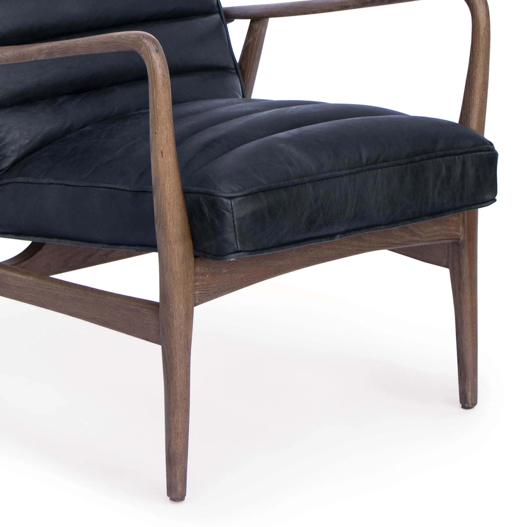With aged marte wood finish, supple black leather and pitched architecture, the Piper commands a sleek visual presence while showcasing natural materials. The channeled back and seat increase comfort atop the petite, designer frame. They look great in pairs, sharing an end table or facing each other across a cocktail table with adjourning sofa.