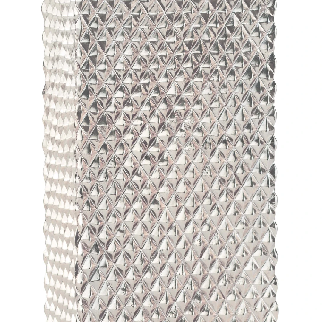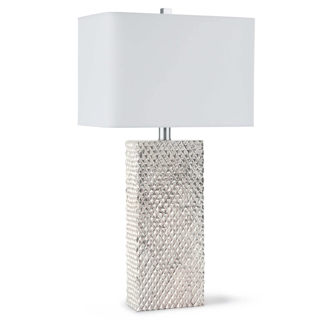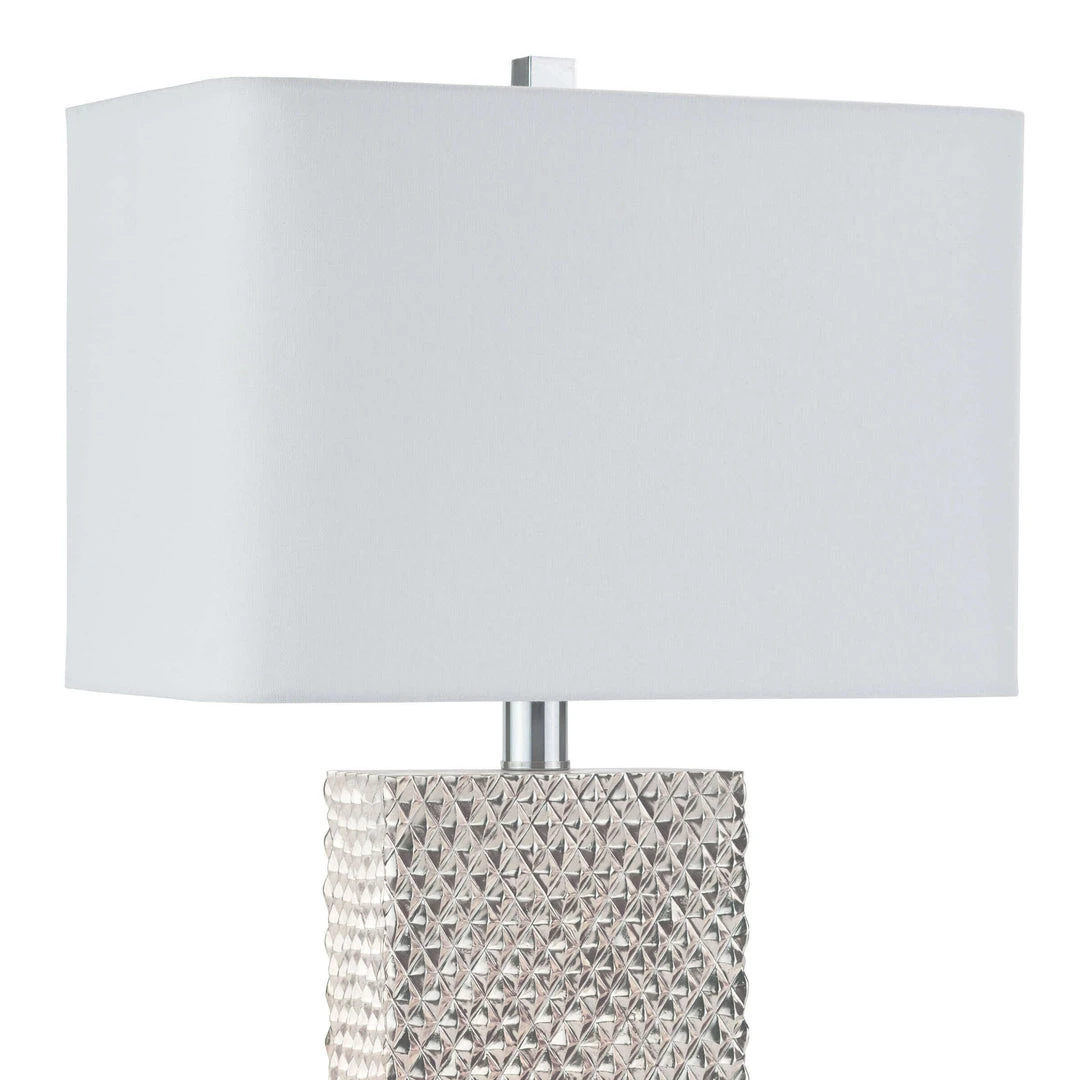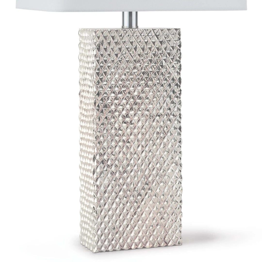 Supported by an amber ed-silver finished, this table lamp immediately draws the eye with the expressive, textural design of its body. A crisp natural linen rectangle shade completes the modern look.