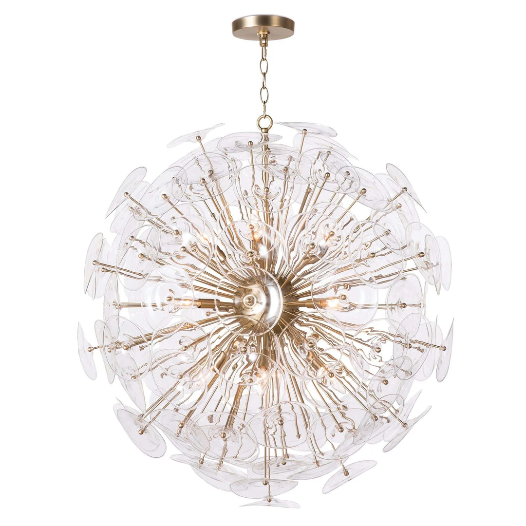 Create a glamorous modern statement in your dining room or master bath with Poppy, a stunning sputnik-style orb chandelier. Candelabra bulbs provide beautiful ambient illumination through undulating clear glass discs, both affixed to natural brass rods of varying lengths that provide dimension.