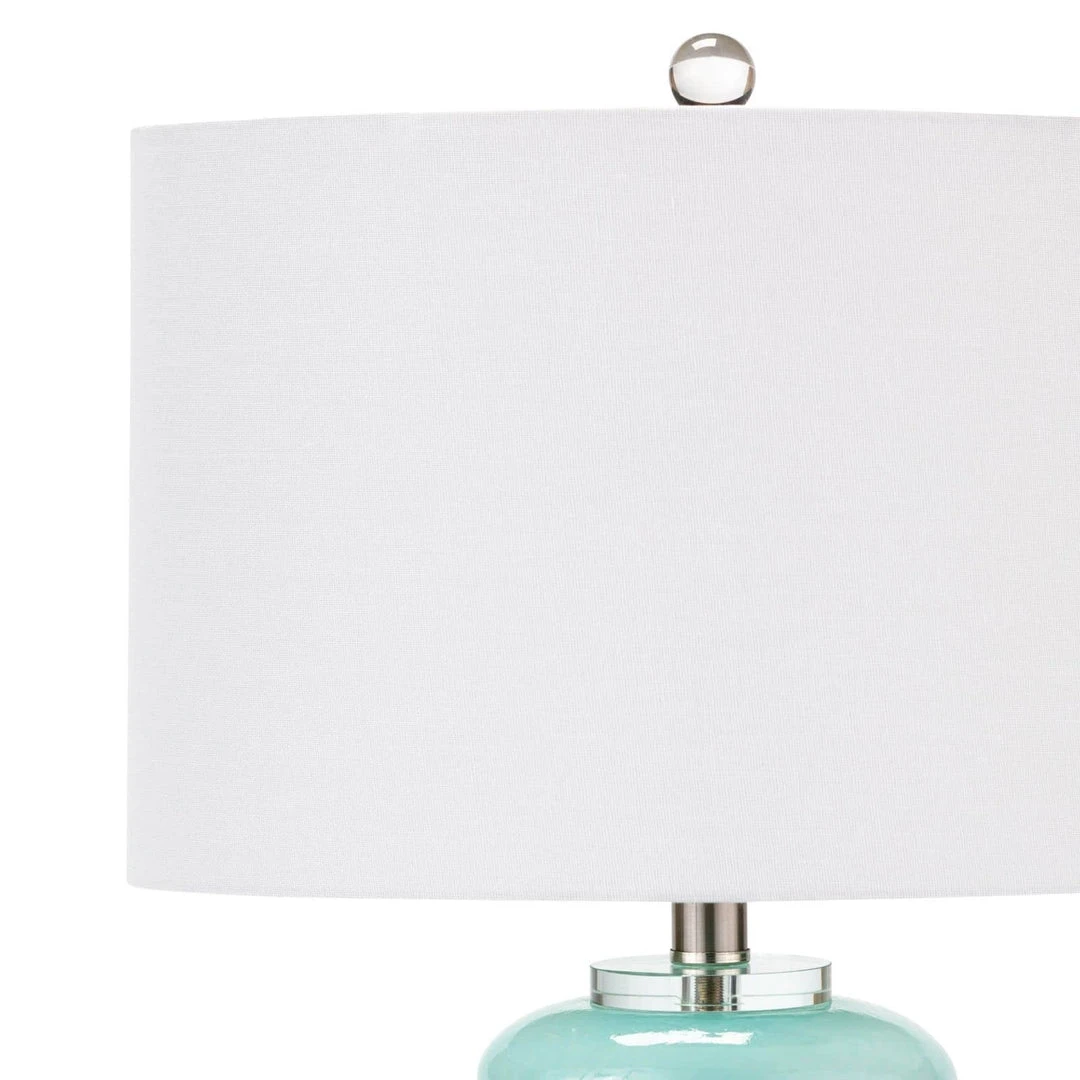 A serene, aqua glass body emulates stacked pebbles on a clear, crystal base, finished with a crystal finial. This lamp has a calming aesthetic that brings the serenity of the natural world into any space.