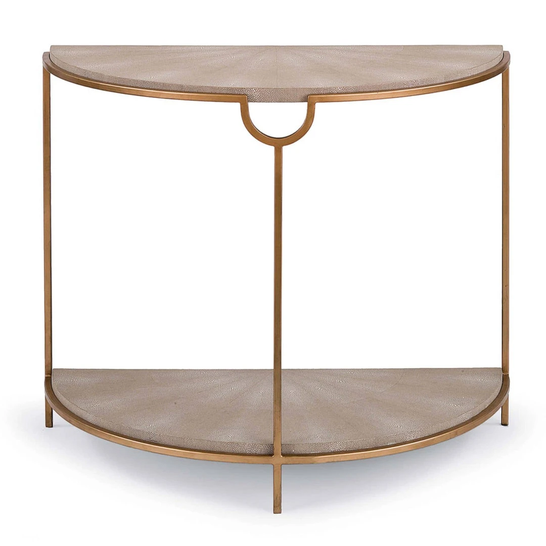 The Vogue Demilune Console can give an any room an unexpected elegance. Combining a natural brass frame and faux shagreen table top, it is just big enough for a bit of lighting, a few Objets, or a place to perch a libation.