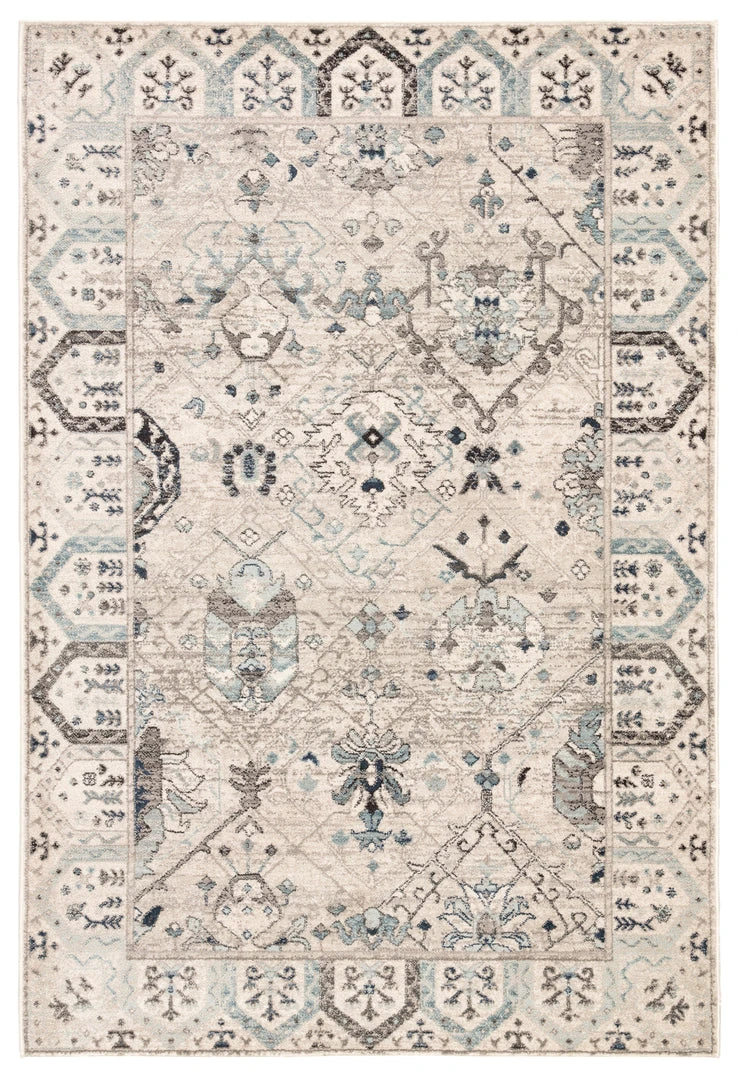 Inspired by classic Turkish patterns, the Berkeley collection features faded Oushak designs in transitional, calming colorways. The Lennox area rug showcases geometric and floral motifs in serene, relaxed hues of gray, ivory, and light blue. Made to withstand heavy foot traffic and lived-in spaces, this power-loomed polypropylene rug boasts soft, medium pile.