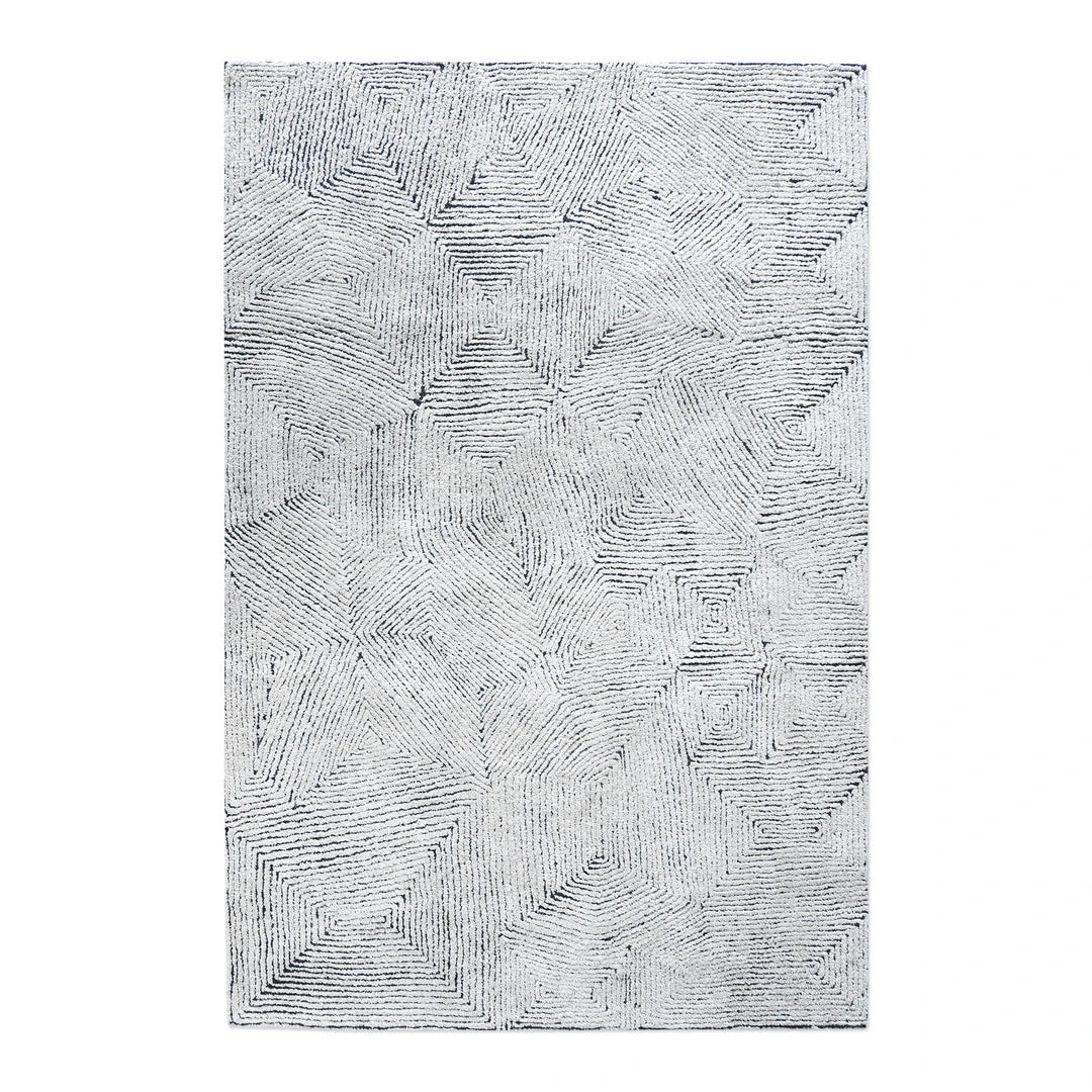 Hand tufted ivory wool and rescued denim with a plush cut pile.