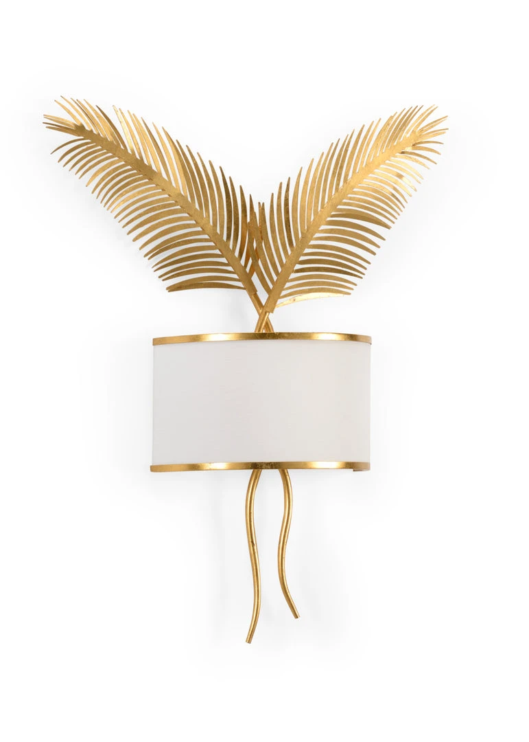 Enhance Your Coastal Home Giving It A Tropical Aura. Double Palm Sconce Features A Pair Of Hand Finished, Antique Gold Leaf, Palm Leaves With A Linen Shade. The Two Lights Of This Sconce Refract Light Off Of The Gold Tone And Emit A Soft Warm Glow Around The Space. May Be Used As A Pair Beside A Mirror Over A Bathroom Vanity, Living Room Sofa Or Entryway Console.