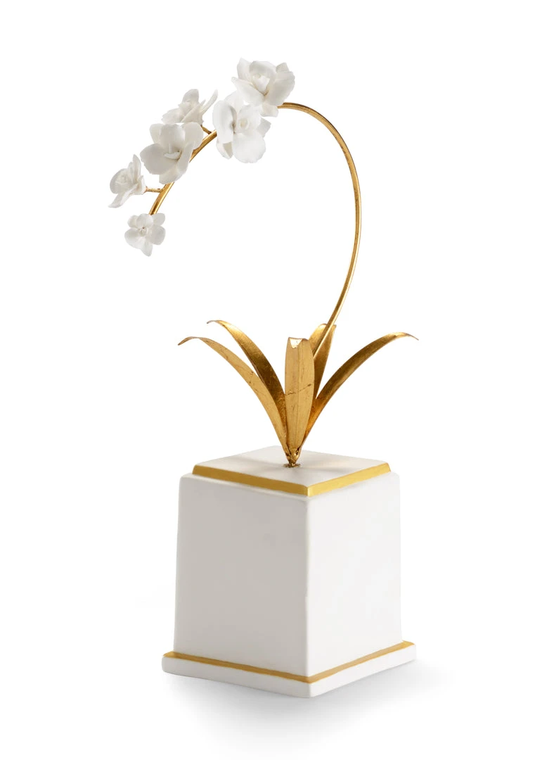 Add Elegance To Any Table Or Bookshelf With This Lovely Orchid. Base And Flowers Are Hand Crafted Of Matte White Fine Porcelain With Gold Trim. Leaves Are Metal With Antique Gold Leaf Finish. Designed By Bradshaw Orrell.