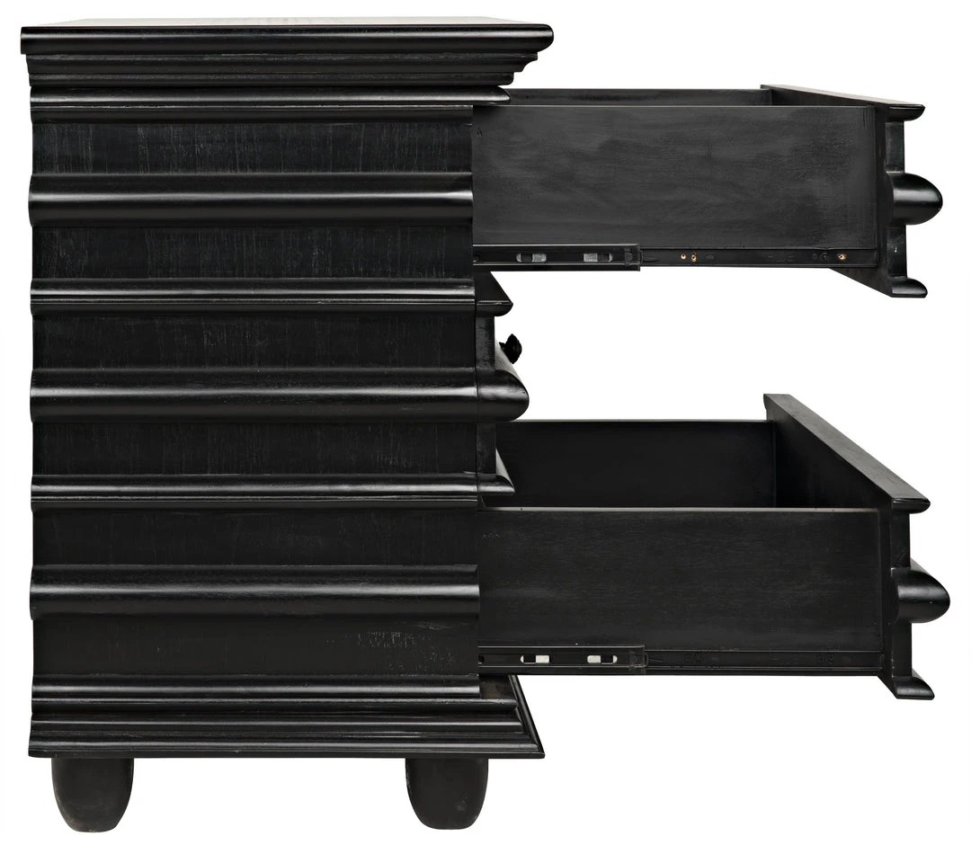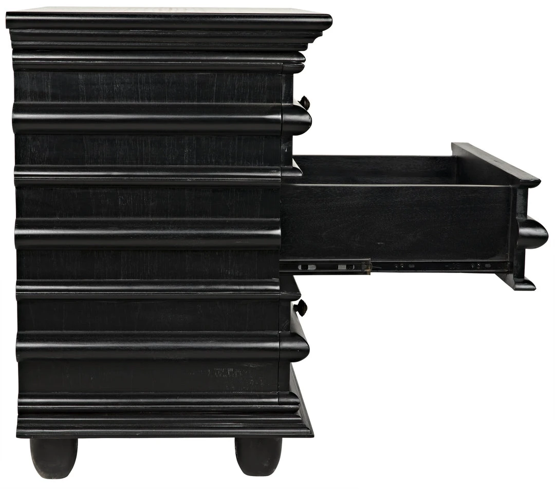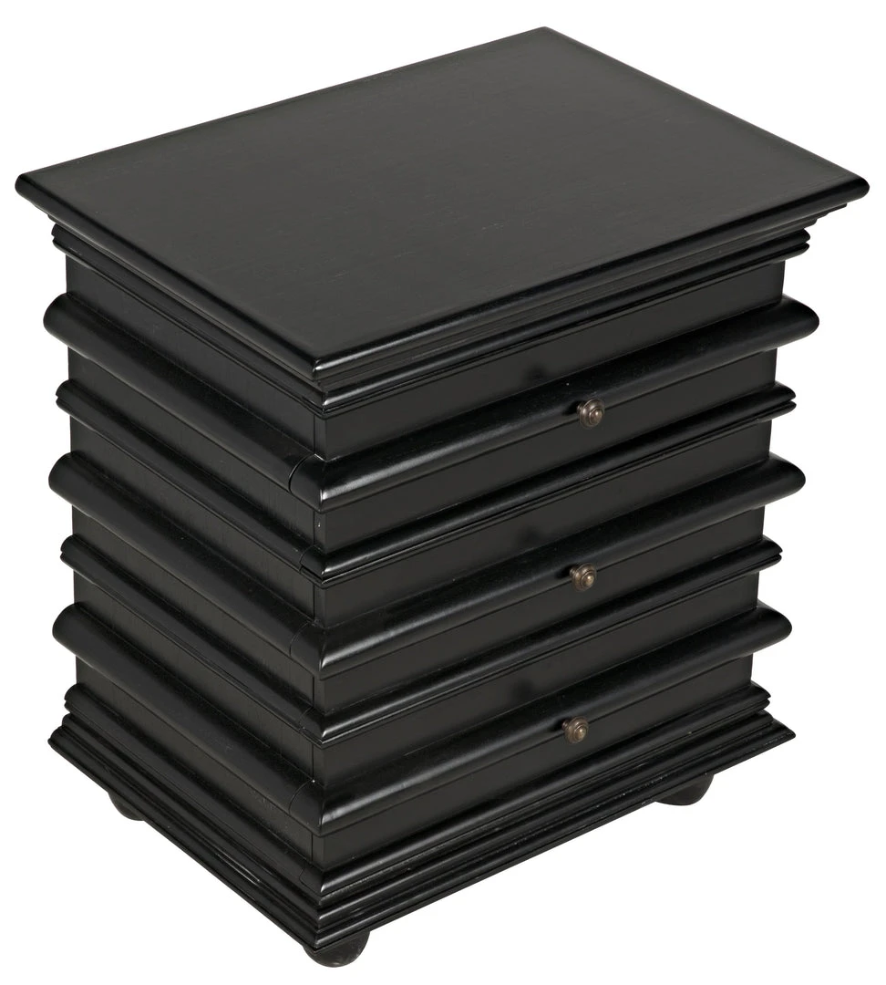 With a design inspired by the jacket of a classic first edition, this handsome, handcrafted mahogany side table features bun feet topped with an elaborately ribbed design. Finished in two hand-rubbed stains, each has three generous drawers and coordinating hardware.