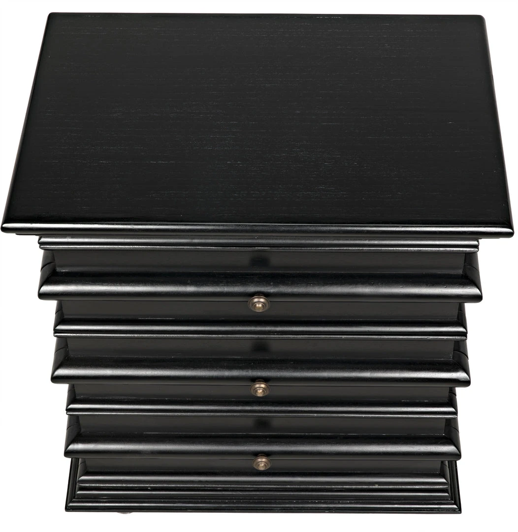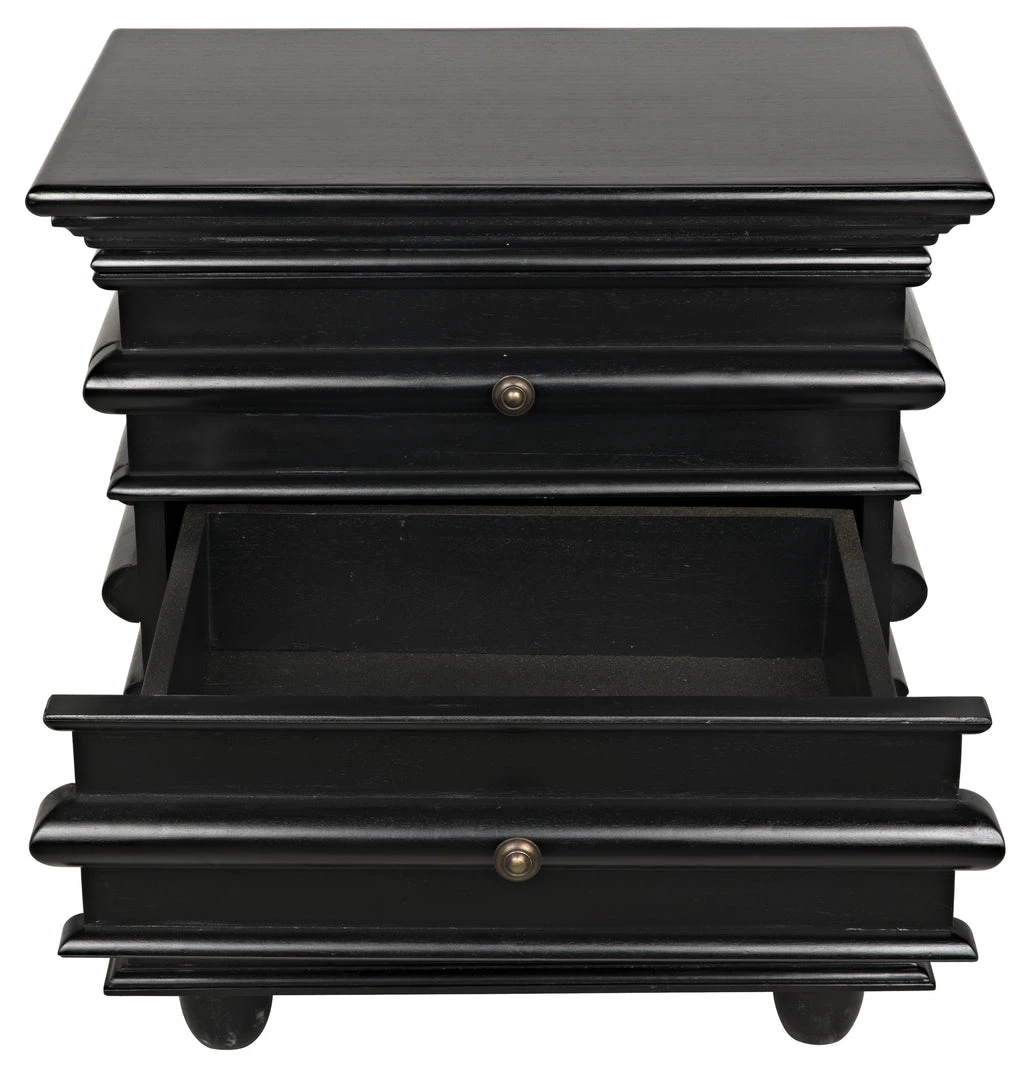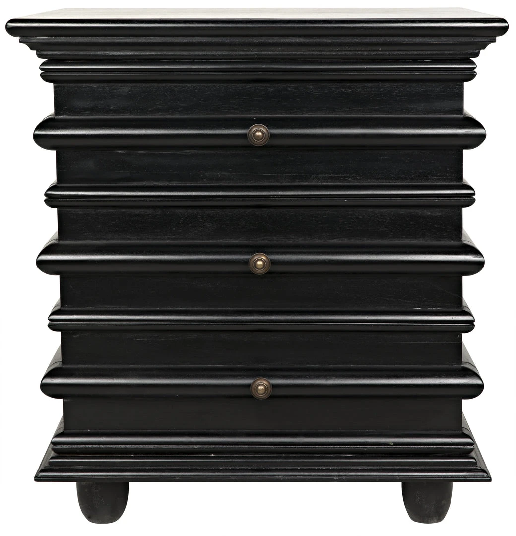 With a design inspired by the jacket of a classic first edition, this handsome, handcrafted mahogany side table features bun feet topped with an elaborately ribbed design. Finished in two hand-rubbed stains, each has three generous drawers and coordinating hardware.