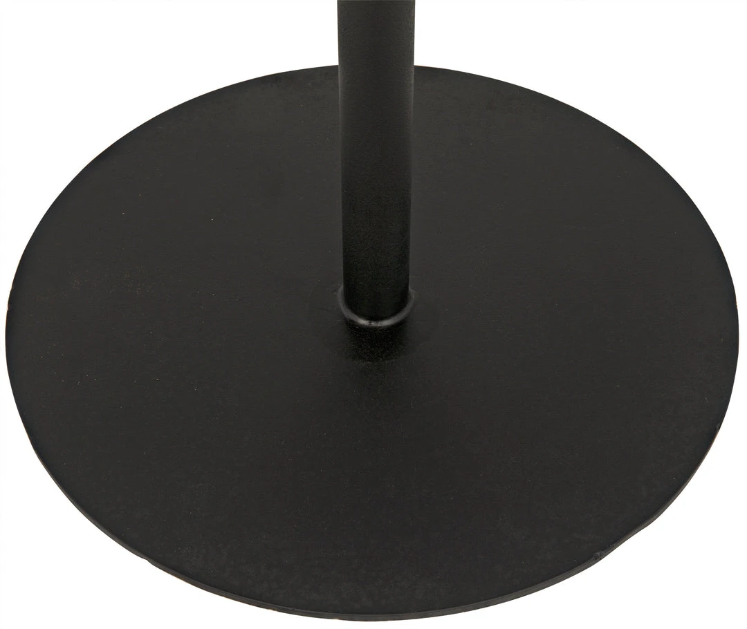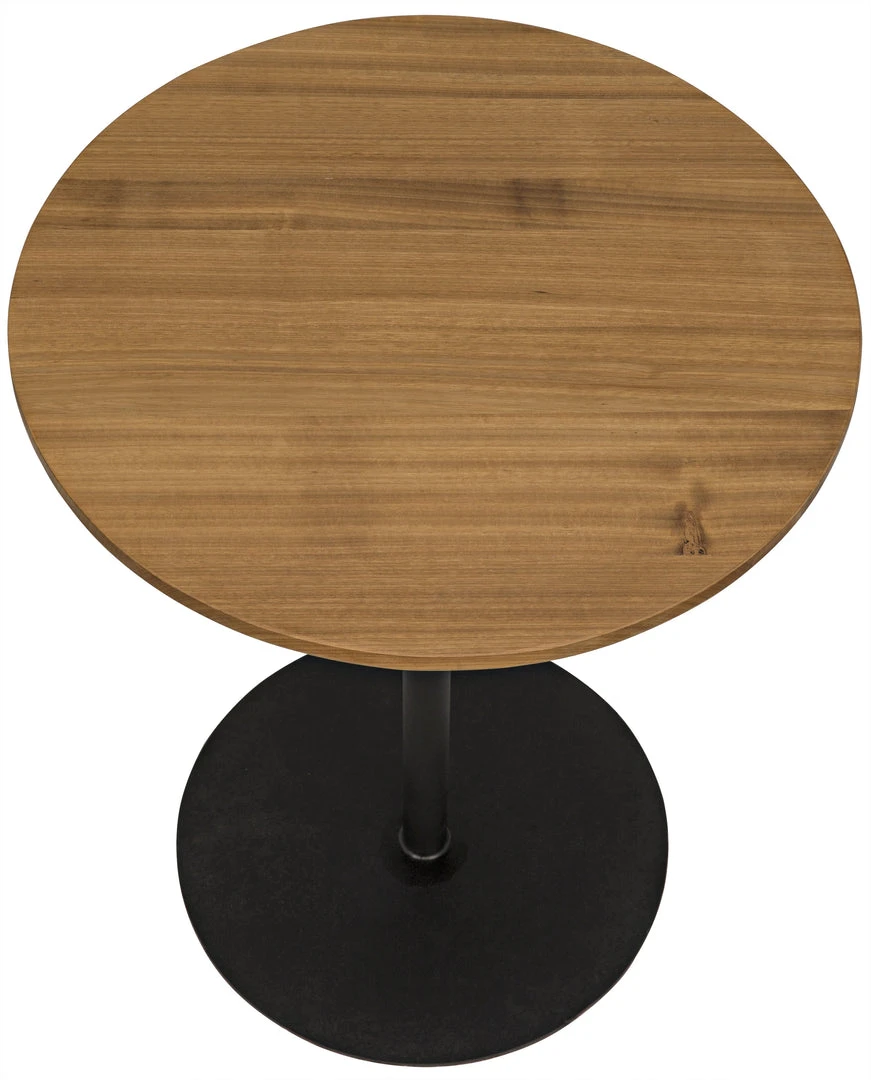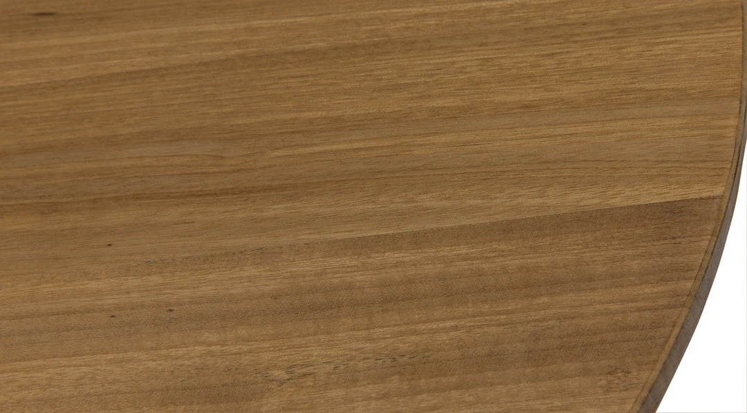 A simple round of expertly finished gold teak contrasts with, and perfectly complements, a round metal base in this simple, but masterfully realized design.