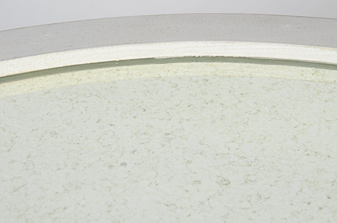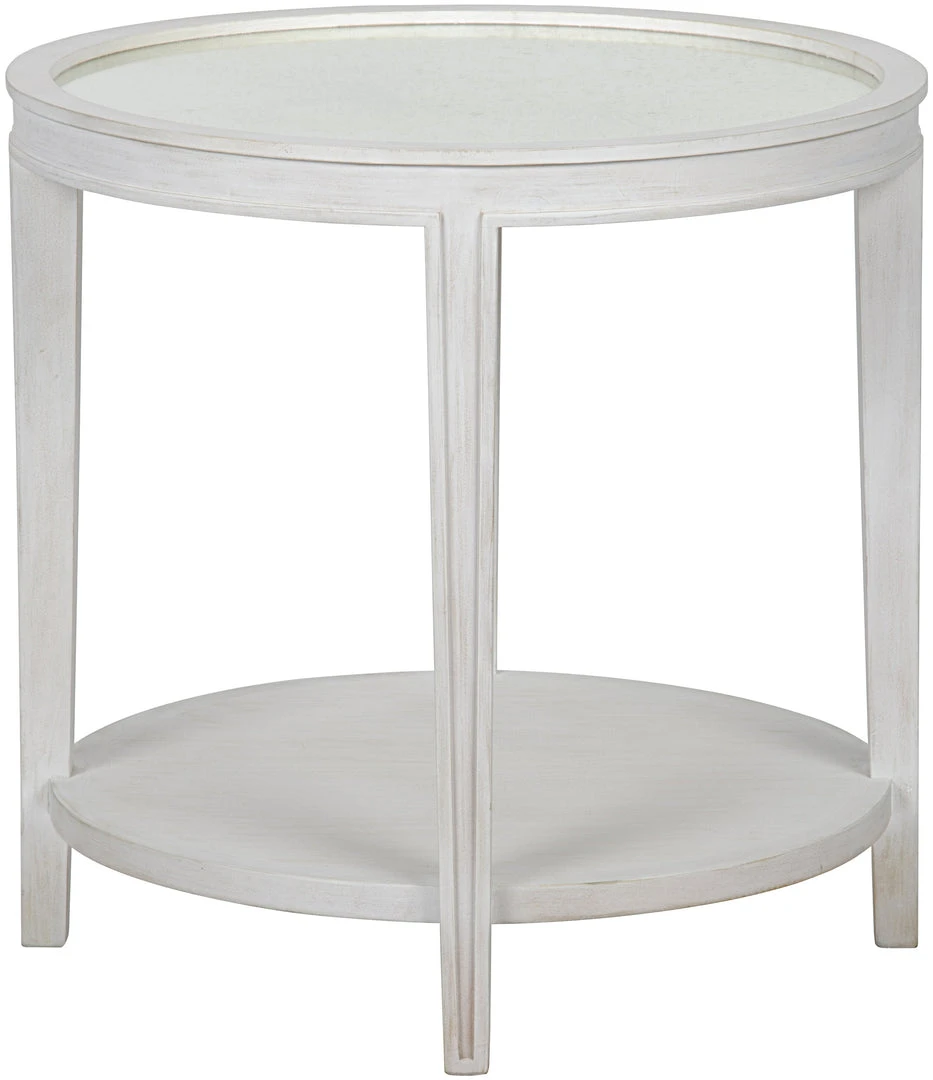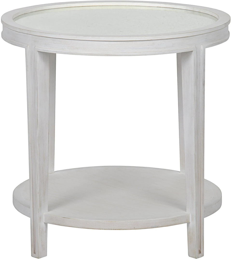 This classically elegant side table has been hand-carved of mahogany and topped with a circle of antiqued mirrored glass. Its Marlborough inspired legs are enhanced with simple fluted details, and a lower shelf allows additional display options. White wash finish.