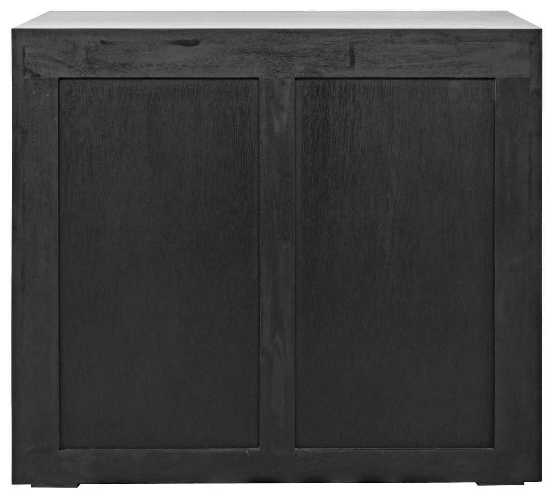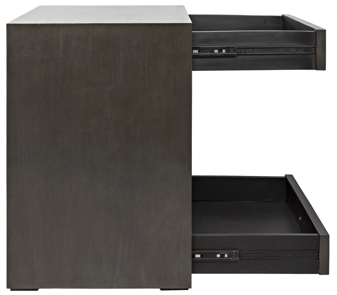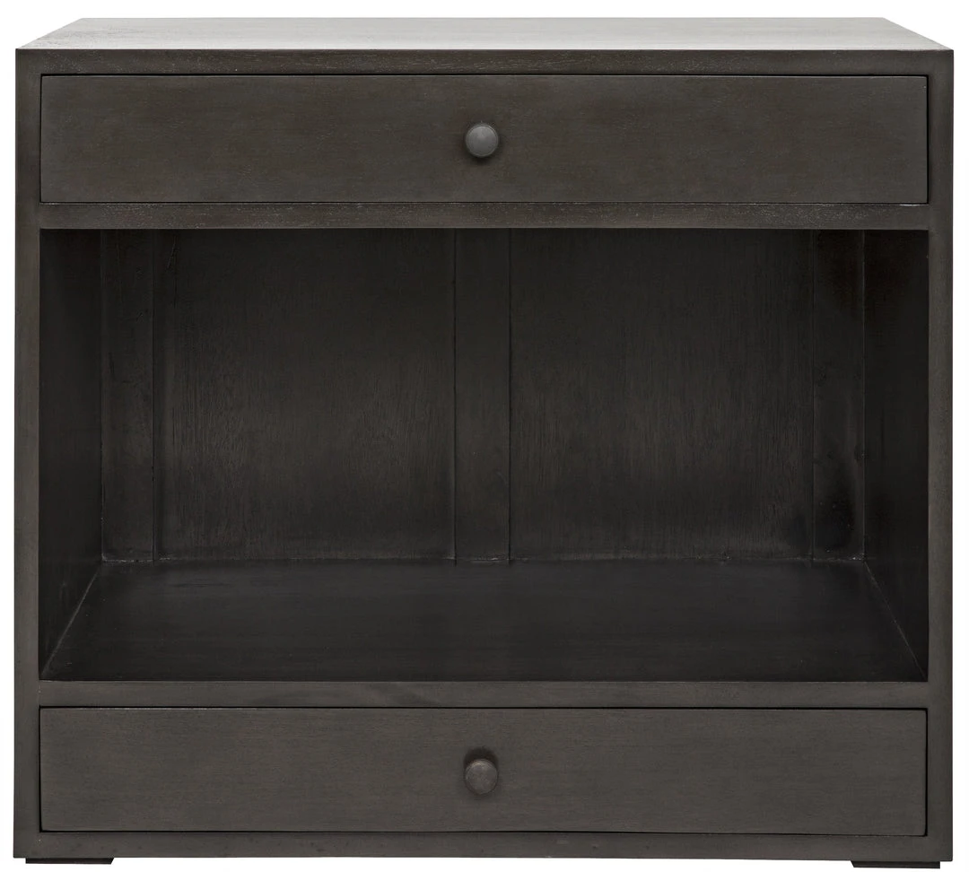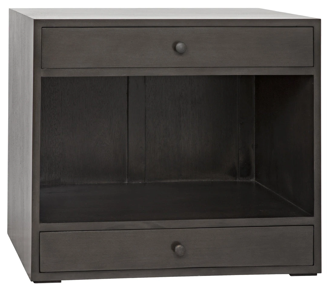 With open spaces for display, and two drawers for privacy, this straightforward, solid mahogany side table is the perfect bed-side accent. Finished in a pale neutral, it blends easily into nearly any decor.