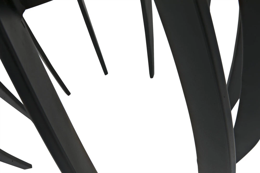 Two elemental materials meet in this boldly designed accent table. The base is formed of multiple geometric legs, and the top is a simple slab of glass. This is a dramatic piece for a sophisticated home.